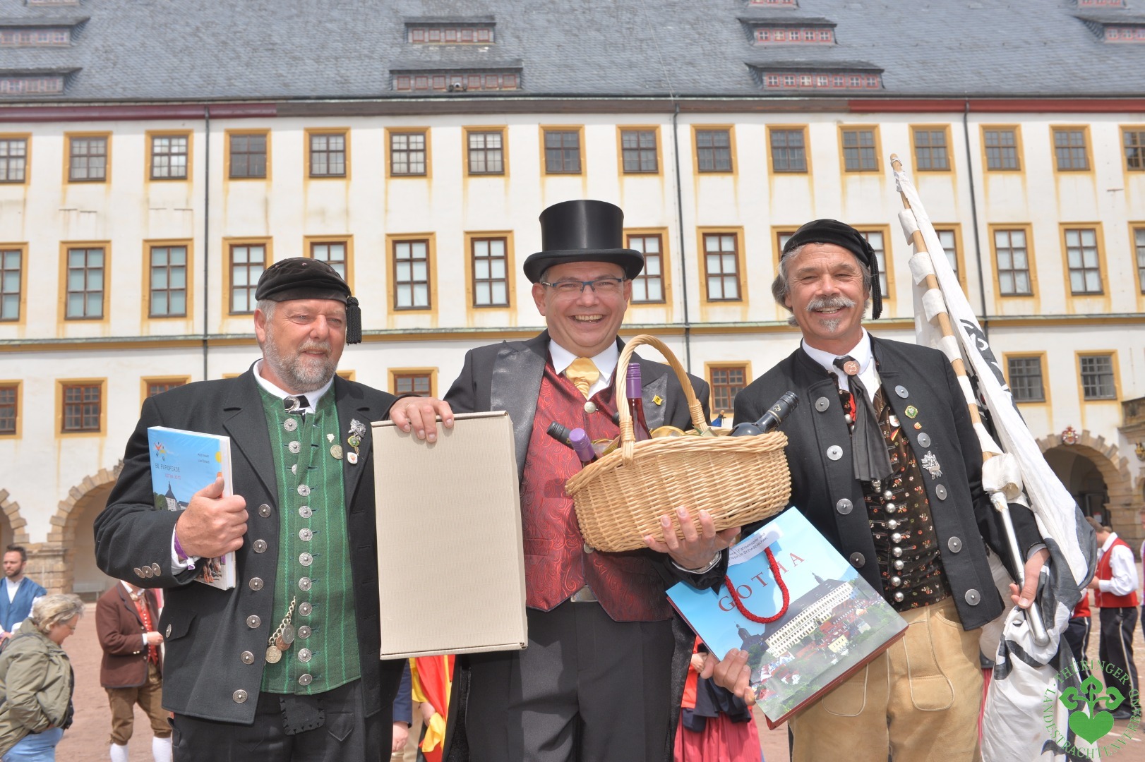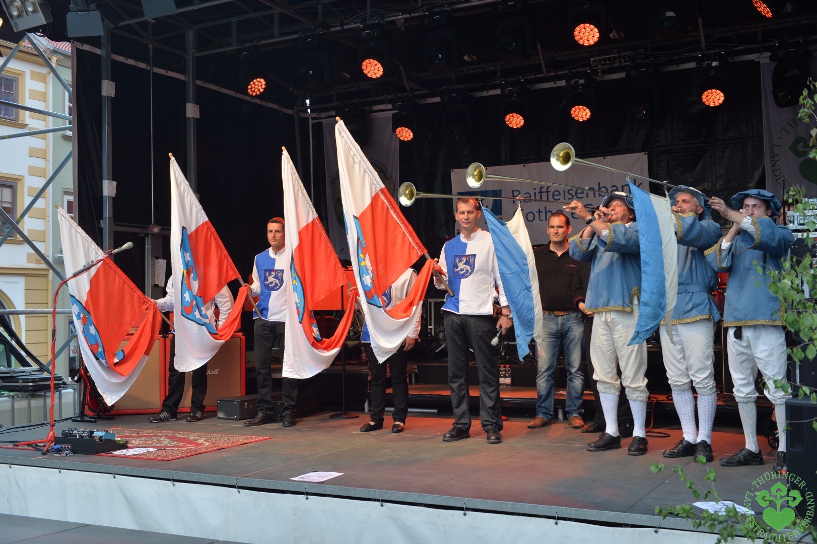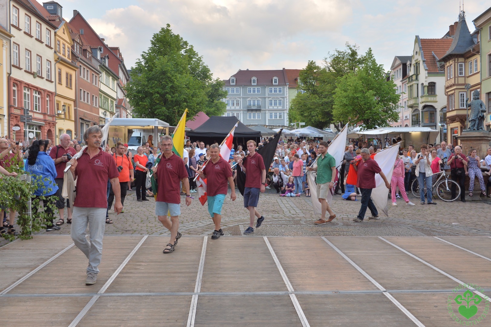 Schon kurz nach der Anreise konnte Gothas Oberbürgermeister Knut Kreuch mit einer Begrüßungsformel in sechs Sprachen die Gäste auf dem Hauptmarkt willkommen heißen. Gemeinsam mit den Stadtpfeiffern und Fahnenschwingern der Interessengemeinschaft Schloss Ehrenstein in Ohrdruf eröffnete er das Stadtfest, das zum ersten Male in seiner mehr als dreißigjährigen Geschichte in einer Stadt in den neuen Bundesländern stattfand. Wie schon bei der Organisation der 50.EUROPEADE 2013 in Gotha war die Initiative zum 16. Internationalen Fahnenschwingertreffen dem rührigen Thüringer Landestrachtenverband e.V. zu verdanken.