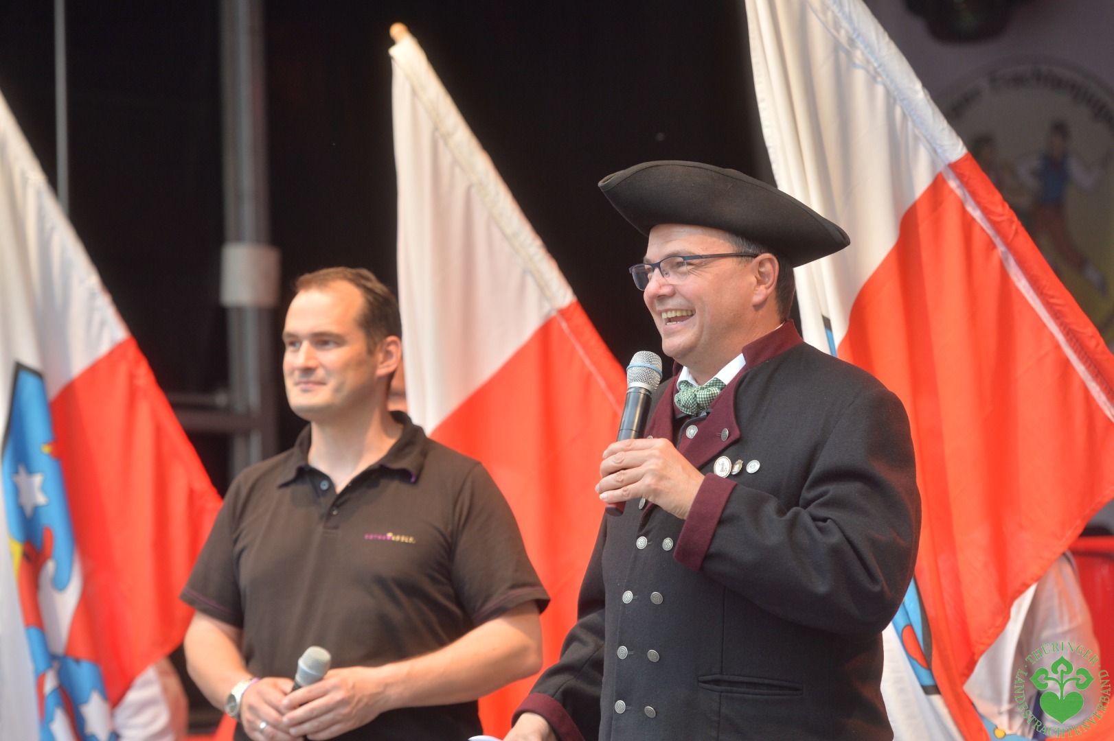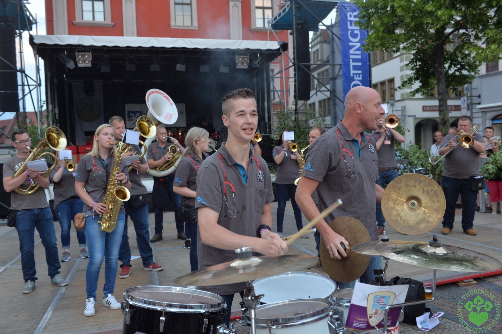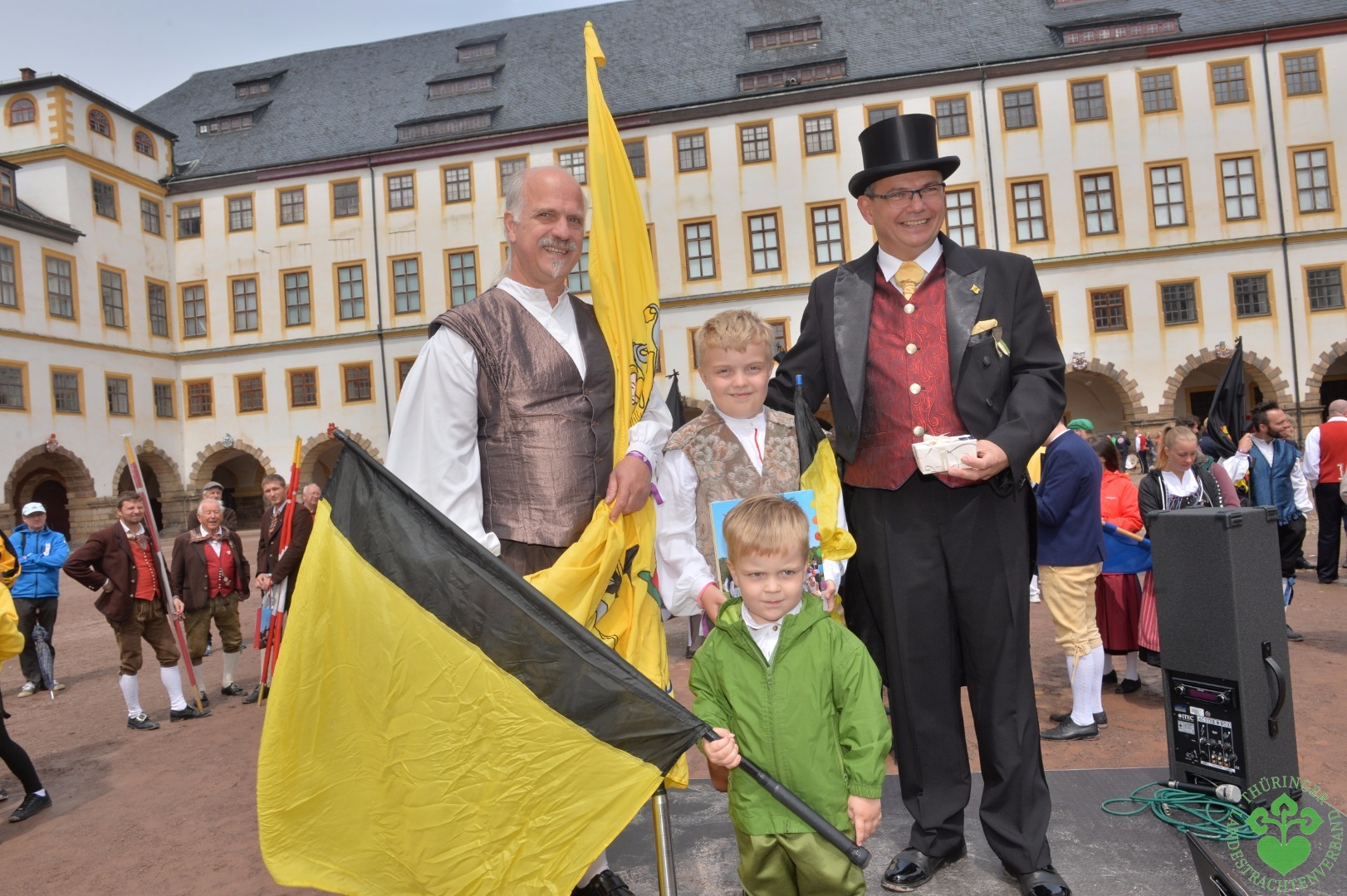 Schon kurz nach der Anreise konnte Gothas Oberbürgermeister Knut Kreuch mit einer Begrüßungsformel in sechs Sprachen die Gäste auf dem Hauptmarkt willkommen heißen. Gemeinsam mit den Stadtpfeiffern und Fahnenschwingern der Interessengemeinschaft Schloss Ehrenstein in Ohrdruf eröffnete er das Stadtfest, das zum ersten Male in seiner mehr als dreißigjährigen Geschichte in einer Stadt in den neuen Bundesländern stattfand. Wie schon bei der Organisation der 50.EUROPEADE 2013 in Gotha war die Initiative zum 16. Internationalen Fahnenschwingertreffen dem rührigen Thüringer Landestrachtenverband e.V. zu verdanken.