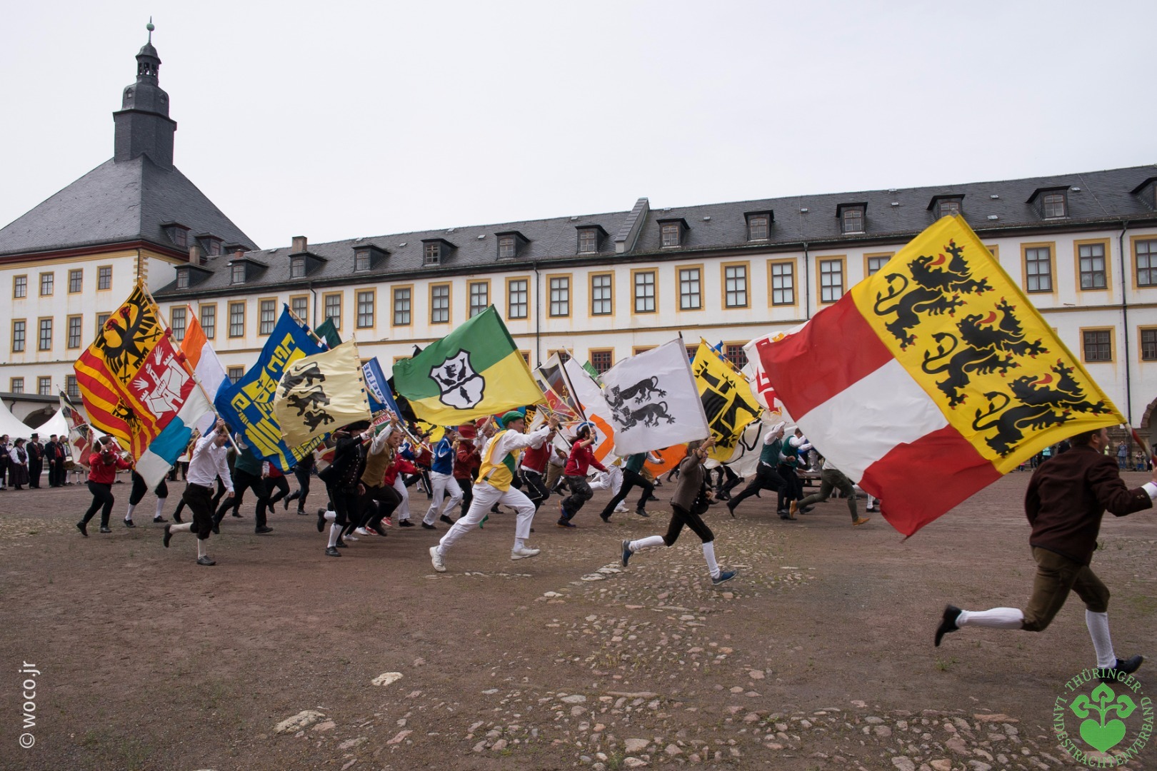 Superintendent Friedemann Witting ließ zum Festgottesdienst in der Hofkirche von Schloss Friedenstein am Sonntagmorgen, nachdem es die ganze Nacht geregnet hatte, die Liedzeile „Güldner Himmelsregen, schütte deinen Segen auf der Kirche Feld; lasse Ströme fließen, die das Land begießen….“ und keiner der Gäste in der vollbesetzten Kirche wollte diesen Worten Glauben schenken. Kann man einem Fest so viel Regen wünschen? Selbst Christian Friedrich Witt, der vor genau 300 Jahren in Gotha verstorbene Komponist des Liedes, der Johann Sebastian Bach seinen Platz zur Aufführung von dessen erster großer Passion räumte, konnte das nicht gewollt haben. Und so kam es anders, denn nach der Kirche, schien die Sonne zwischen den unterschiedlichen Türmen von Schloss Friedenstein hervor und es begann auf dem Schlosshof eine Parade von mehr als 100 Fahnen in der Choreografie von Christian König.