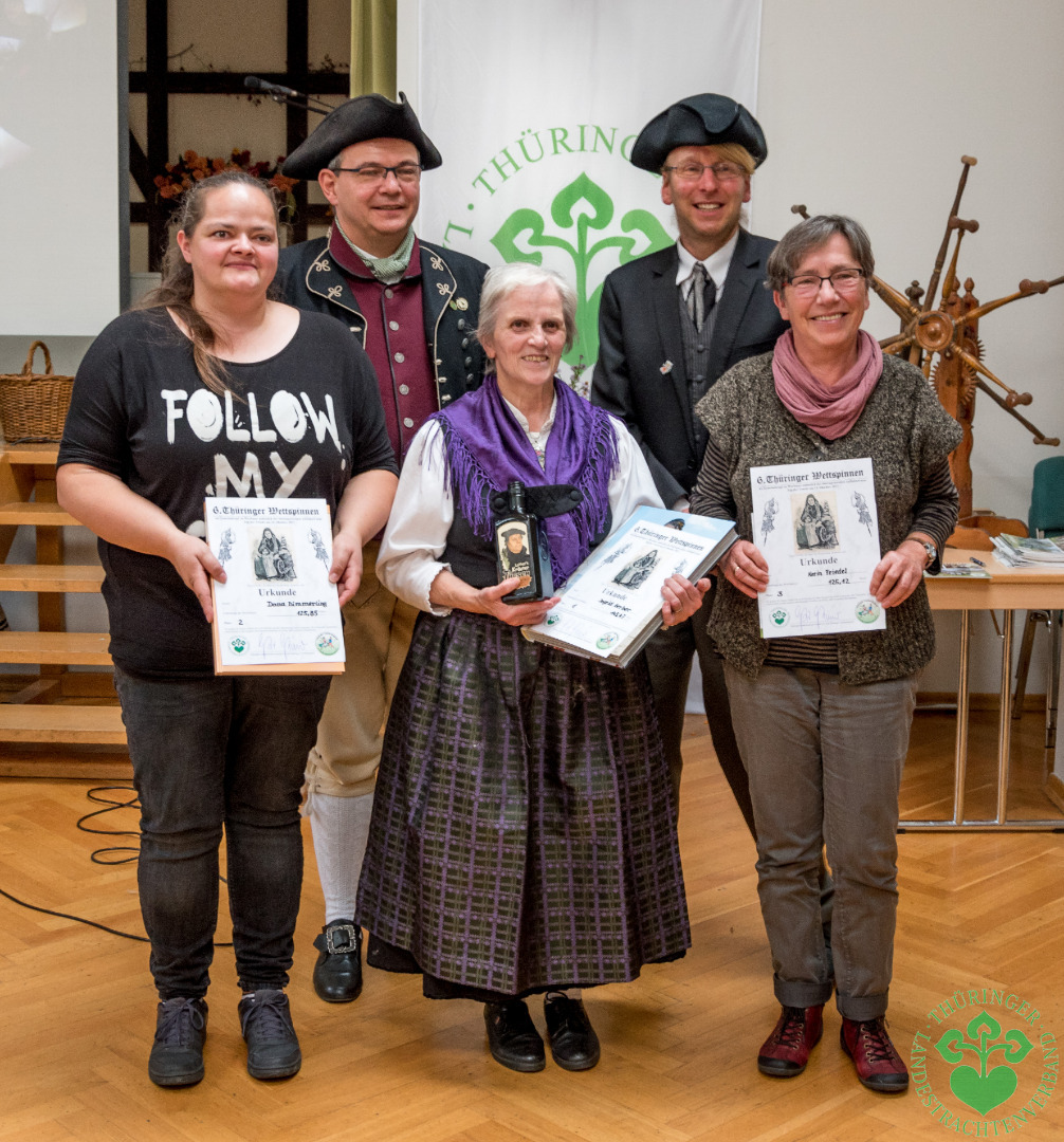 Am Ende reichte es den bei erwachsenen Thüringern leider nicht zum Sieg. Die Gewinnerin Ingrid Gerber schaffte 145,47 Meter. Sie kommt von der Spinngruppe Ahorn bei Coburg. Die Zweitplatzierte Diana Dimmerling war schon bei mehreren Thüringer Wettspinnen dabei und ist im hessischen Blankenau daheim. Sie erreichte 125,85 Meter. Die Drittplatzierte Karin Friedel spinnt zwar in der Ostthüringer Spinngruppe Etzdorf, wohnt jedoch in Seidewitz in Sachsen-Anhalt. Sie schaffte 125,12 Meter. Im Jugendbereich siegte die 14-jährige Lea Zimmermann aus Öchsen in der thüringischen Rhön mit 103,60 Metern.