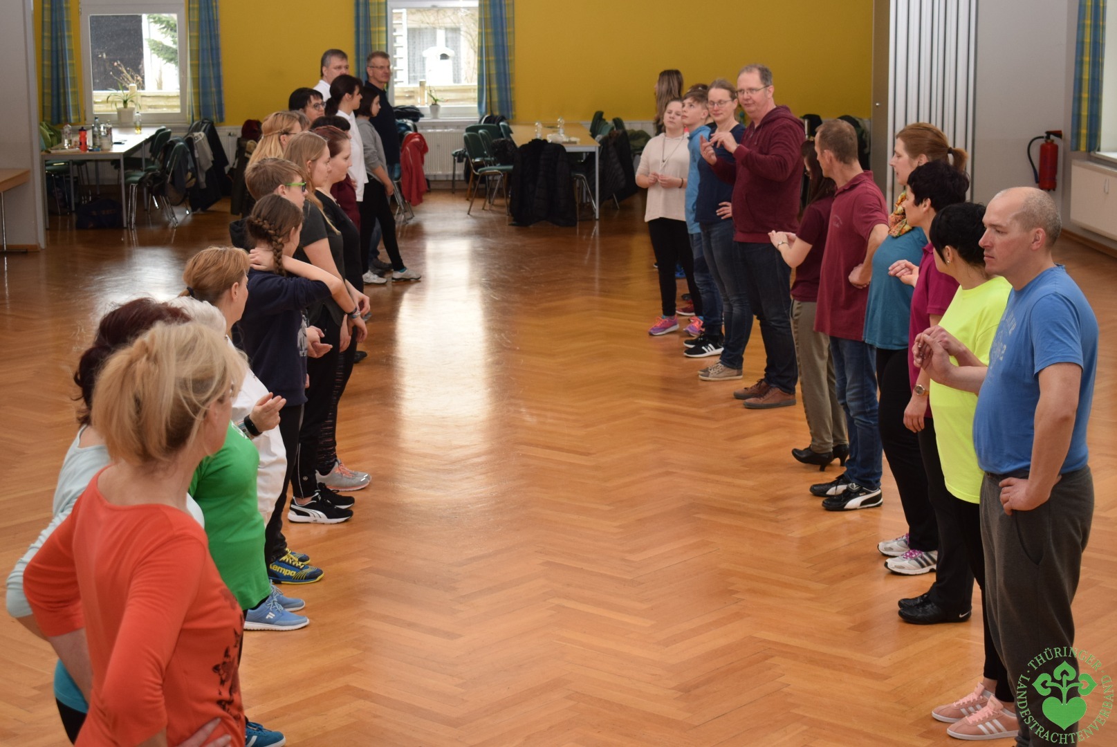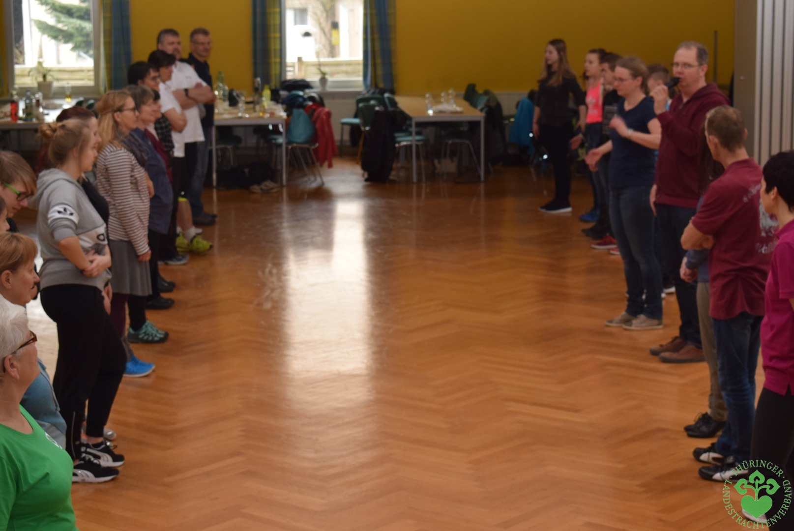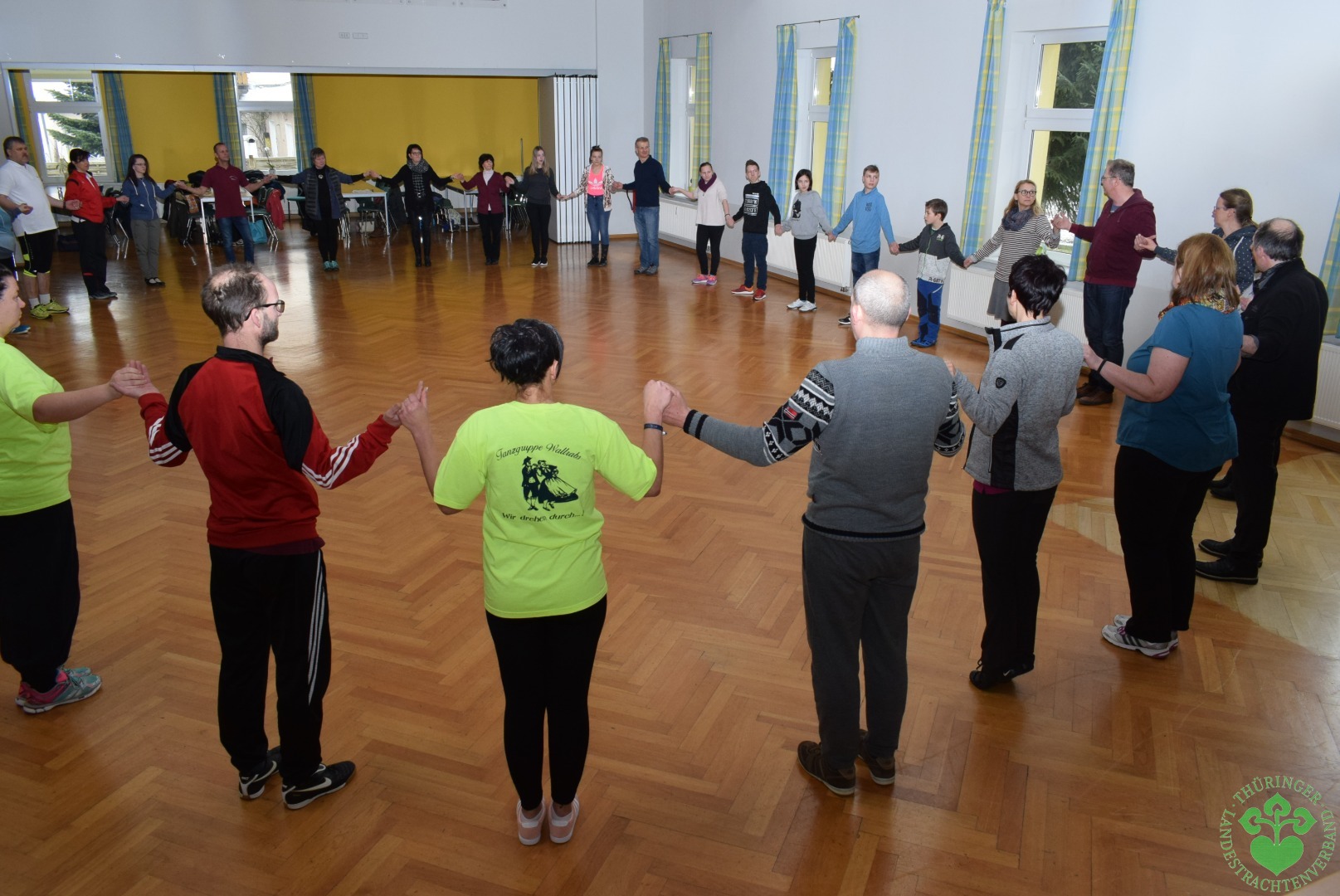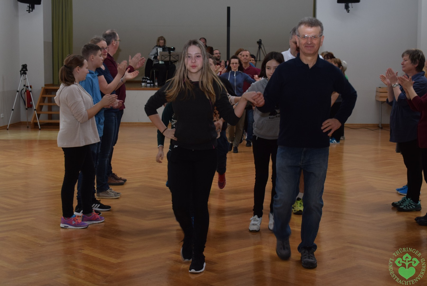 32 Teilnehmer trafen sich am Samstag, den 3. März 2018 im Gemeindesaal Wechmar, um gemeinsam die verschiedensten Varianten des Quadrilletanzes einzustudieren und alle, vom 12jährigen Tänzer bis zur 76jährigen Tänzerin waren mit Begeisterung dabei. Keine leichte Aufgabe für Christian Lantau und seine Frau, aber sie nahmen die Herausforderung an und waren voll des Lobes über die Konzentration und Kondition der Teilnehmer, so dass am Ende nicht nur dem Tanzleiter ein zufriedenes Lächeln im Gesicht stand, sondern auch den Tänzern die Freude über ein sehr erfolgreiches Tanzseminar anzusehen war. Ein herzliches Dankeschön gehen an Gesa und Christian Lantau für die Tanzanleitungen und nicht zu vergessen an die Musiker Tanja Opp und Christopher Luckhardt, denn was wäre eine Quadrille ohne Livemusik und die Beiden haben das hervorragend gemeistert.