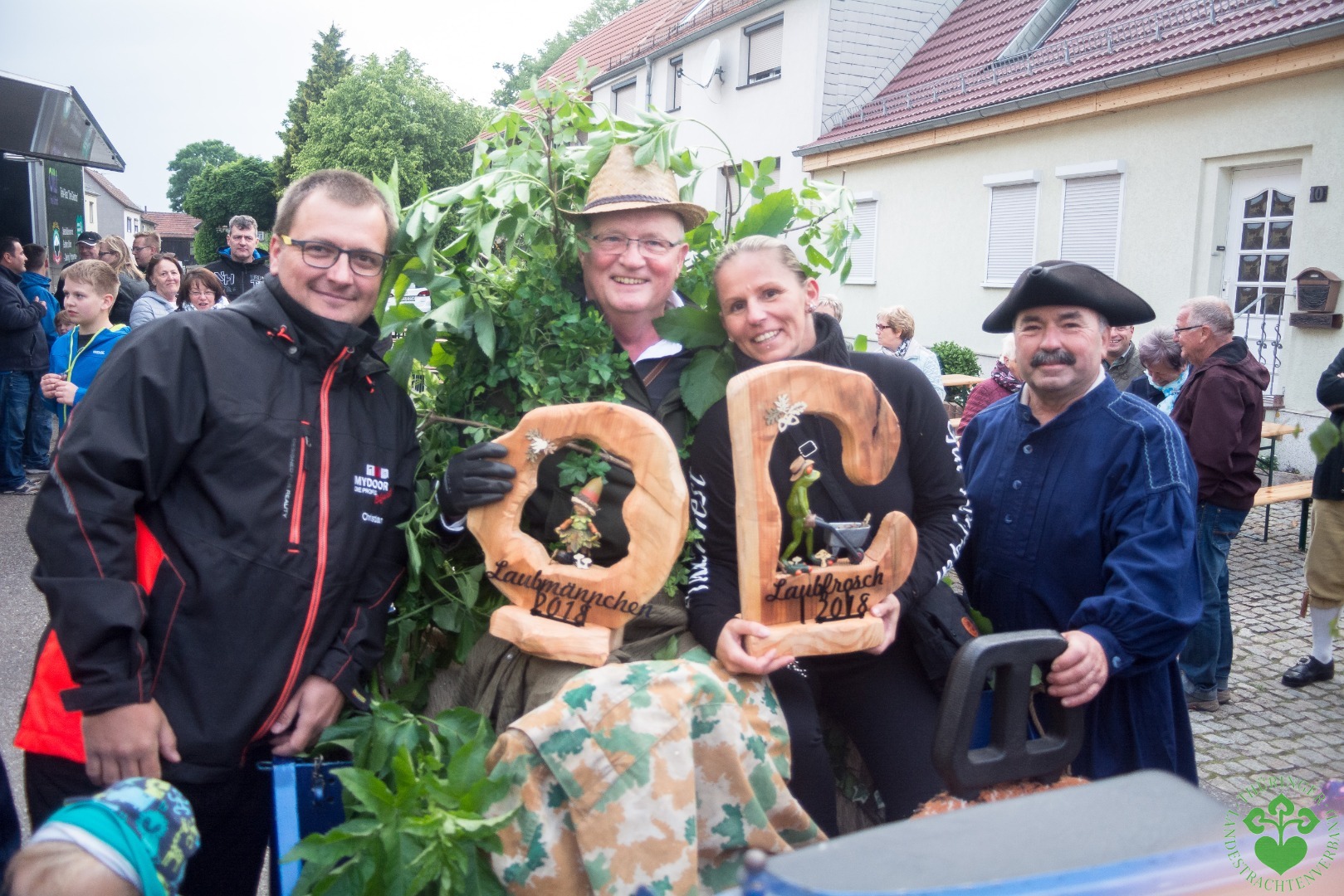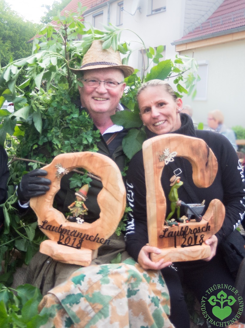 Als dann das Laubmännchen den Festplatz betrat, startete die heitere Raterunde. In diesem Jahr machten es die Veranstalter den Gästen aber wirklich schwer. Das Laubmännchen im Trabant Kübel, von Vereinsmitglied Klaus Honauer chauffiert, stellte die Raterunde vor ein Rätsel. Wer steckte in diesem Jahr im komplett grüngehülltem Blätterkostüm? Der Tipp, jeder im Ort hat ihn schon mindestens einmal gesehen und er ist die zweitwichtigste Person im Ort, auch wenn sie nicht selbst aus dem Ort stammt, brachte Sandra Becker die erleuchtende Idee und erriet Joachim Kalb, den Inhaber des Edeka Marktes im Laubmännchenkostüm. Laubmann Joachim Kalb und Laubfrosch Sandra Becker erhielten neben den Titel, den sie für ein Jahr tragen dürfen, auch einen von Christian Fritz in wunderbarer Handwerkskunst gefertigten Pokal.