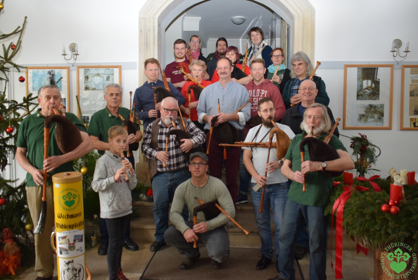 Bach-Stammort Wechmar: Mit zwei völlig ausverkauften Konzerten im Rokokosaal des Landhauses Studnitz haben die Wechmarer Mühlenpfeiffer ihr zehntes Jubiläumsjahr hochmotiviert beendet. Was im April 2008 nach einer Idee von Dr.Harro Frels als kleines Häuflein musikbegeisterter Laien startete, hat sich in einem Jahrzehnt zu einer thüringerweit beachteten Musikgruppe entwickelt. Seit Anfang an ist der heute dreiundzwanzigjährige Romeo Kreuch der Leiter der Gruppe. Obwohl noch so jung schafft er es die Spieler im Alter von zehn bis siebzig mit Musikstücken, die er meist selbst bearbeitet und für den Dudelsack umgeschrieben hat, an das schöne alte thüringische Instrument heranzuführen. Seit dem Jahr 2008 gibt es mindestens zwei Wochenendkurse im Jahresverlauf, die von dem bekannten süddeutschen Lehrmeister und Kantor Friedhelm Capelle abgehalten werden.