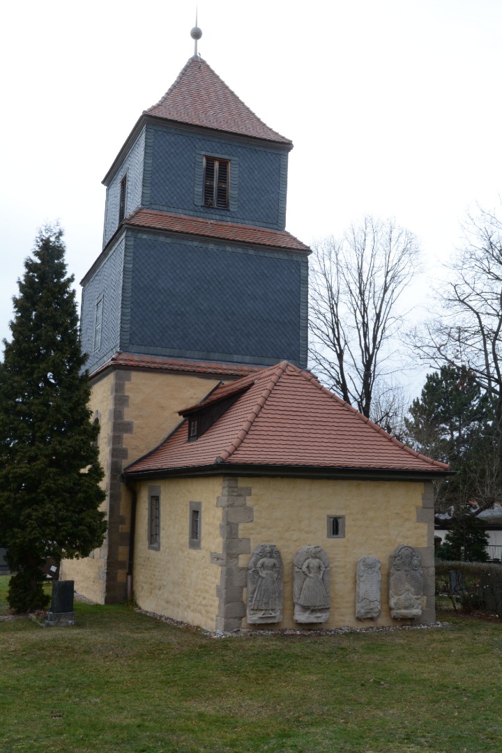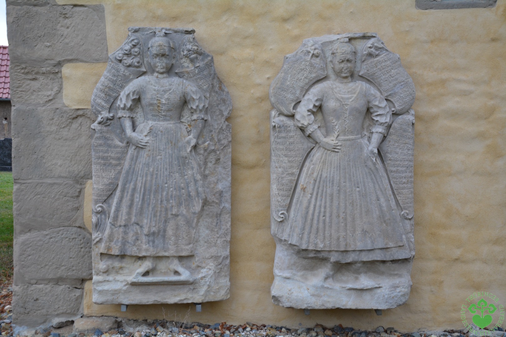 An der Kirchenwand fallen vor allem zwei große Grabsteine auf, die zwei Frauen zeigen: Die im 18. Jahrhundert verstorbenen jungen Schwestern Hildebrand. Sie tragen Hauben, die einigen in der Sammlung des Thüringer Landestrachtenverbandes aufbewahrten Brautkronen ziemlich ähnlich sehen. Sind es eventuell tatsächlich Brautkronen?