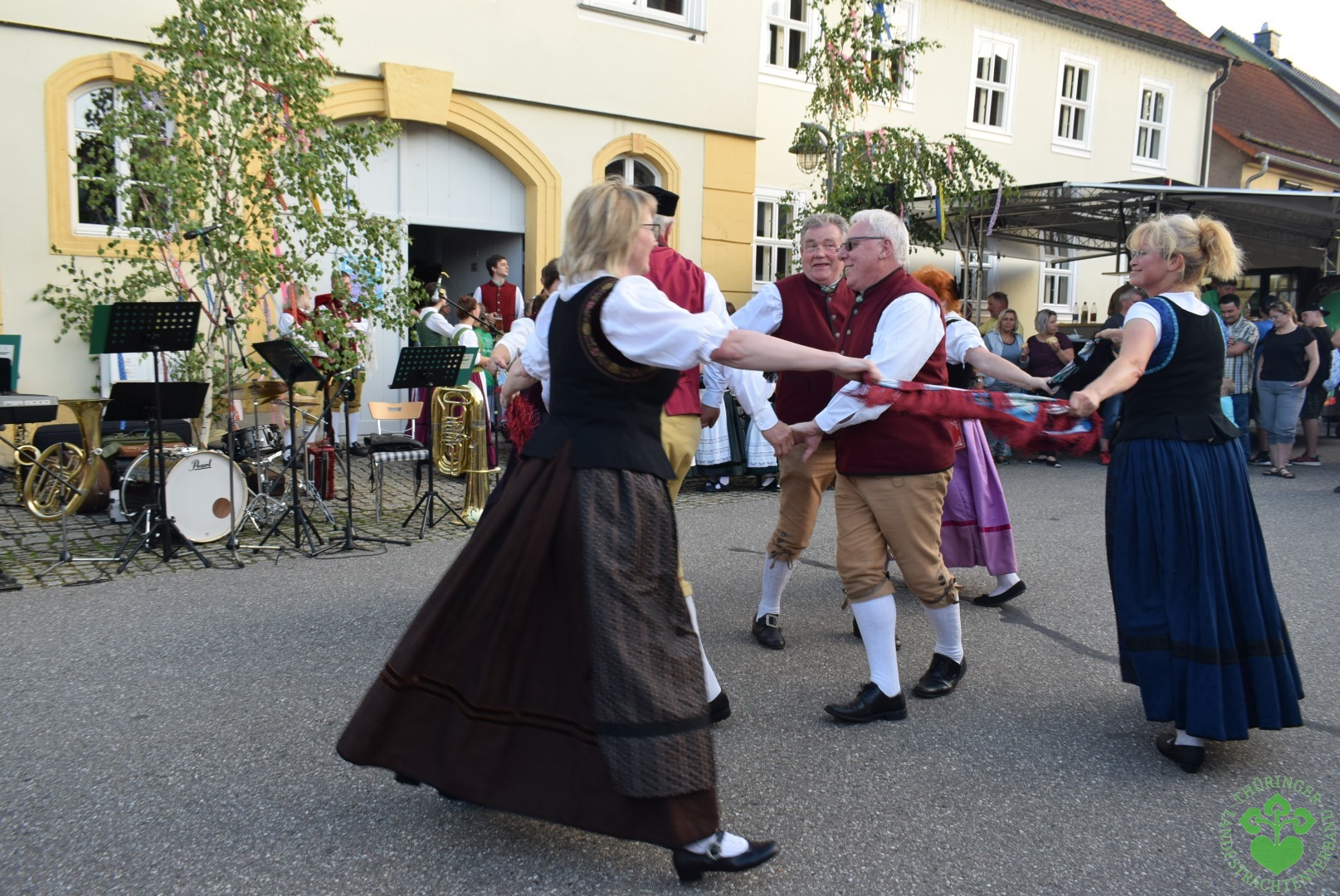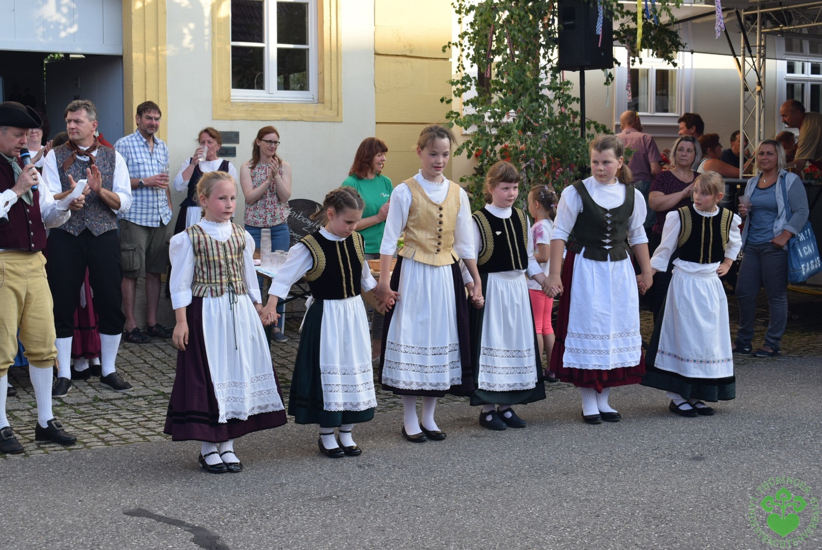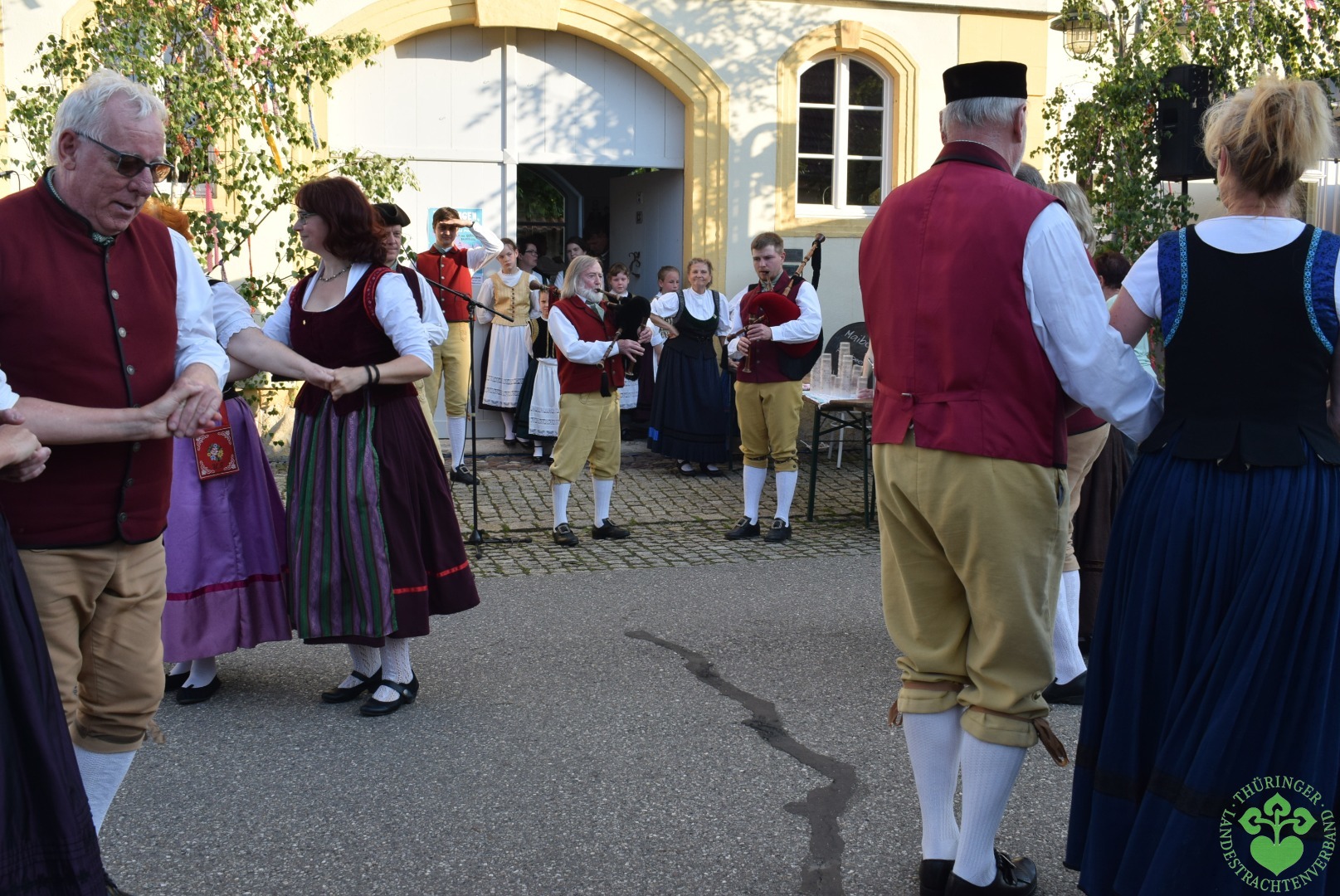 Und dann öffneten sich um 19 Uhr die Fenster des Rokokosaales und ein lustiges Mundartspiel begann, dem sich die flotten Tänze der Studnitzminis, der Studnitzmäuse, der Studnitztänzer und der Trachtentanzgruppe anschlossen. Die Wechmarer Mühlenpfeiffer begleiteten auf ihren Dudelsäcken sogar einen Tanz, so dass sich der Bitumen der Straße zur Tanztenne wandelte.