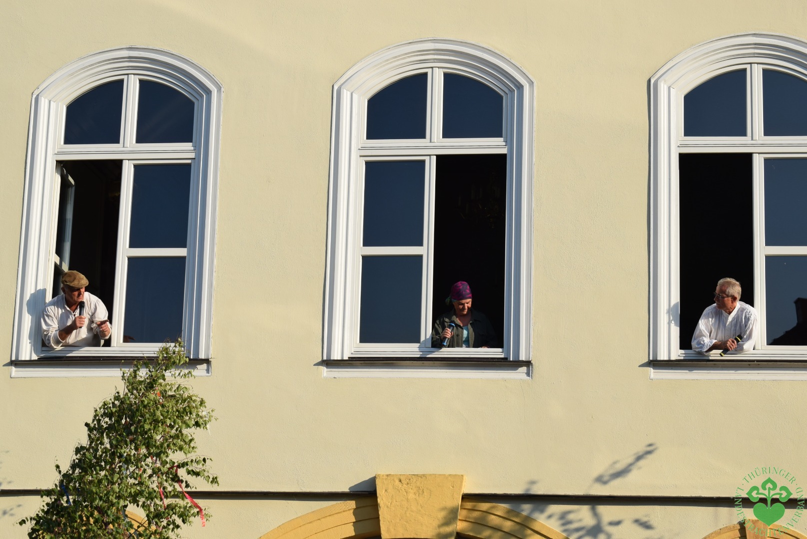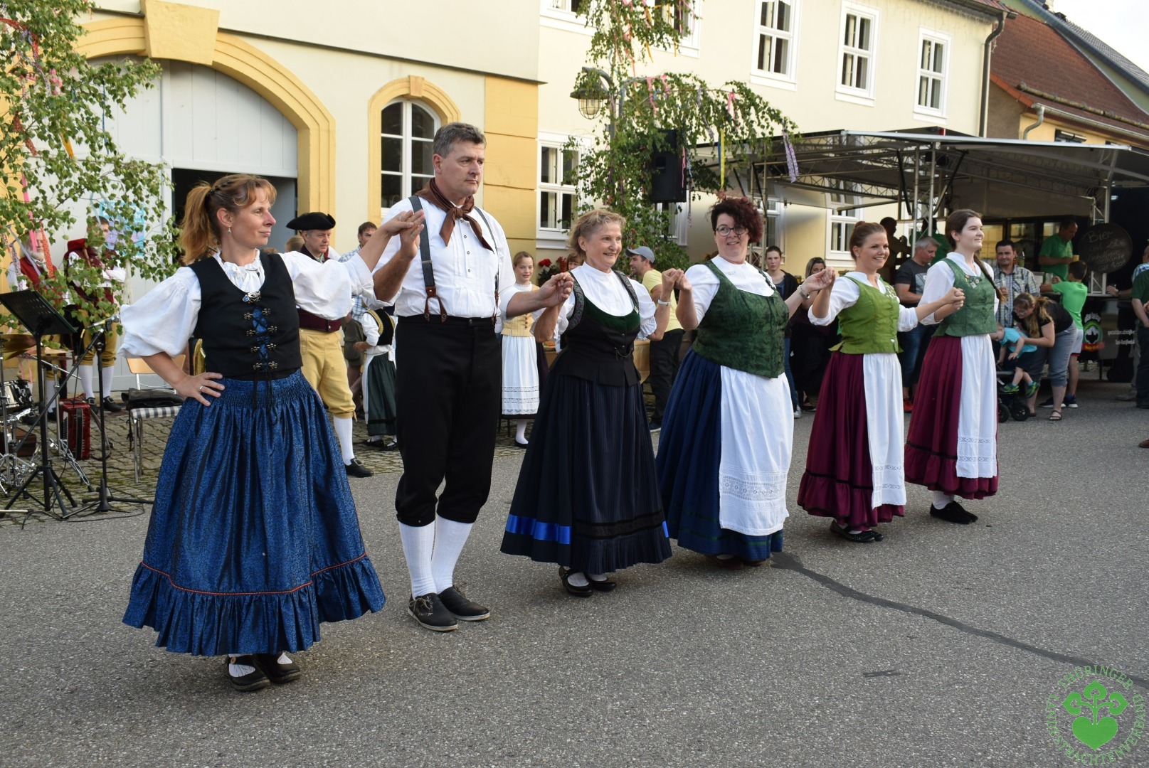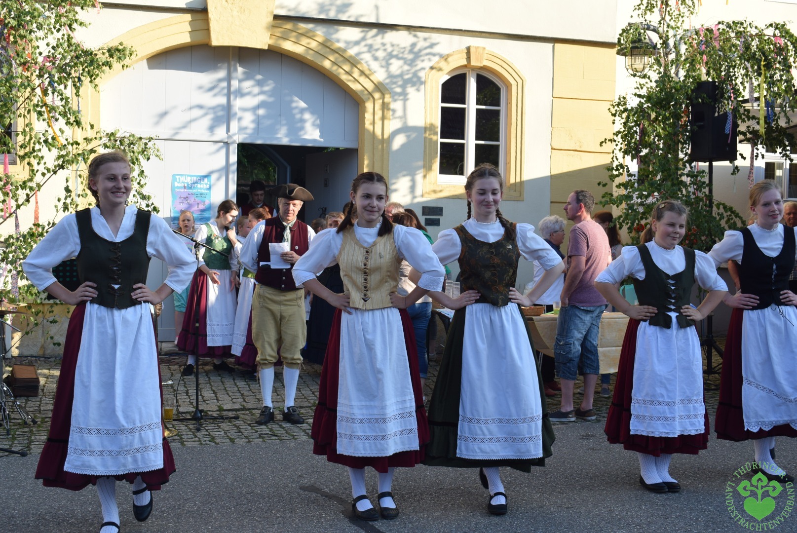 Und dann öffneten sich um 19 Uhr die Fenster des Rokokosaales und ein lustiges Mundartspiel begann, dem sich die flotten Tänze der Studnitzminis, der Studnitzmäuse, der Studnitztänzer und der Trachtentanzgruppe anschlossen. Die Wechmarer Mühlenpfeiffer begleiteten auf ihren Dudelsäcken sogar einen Tanz, so dass sich der Bitumen der Straße zur Tanztenne wandelte.