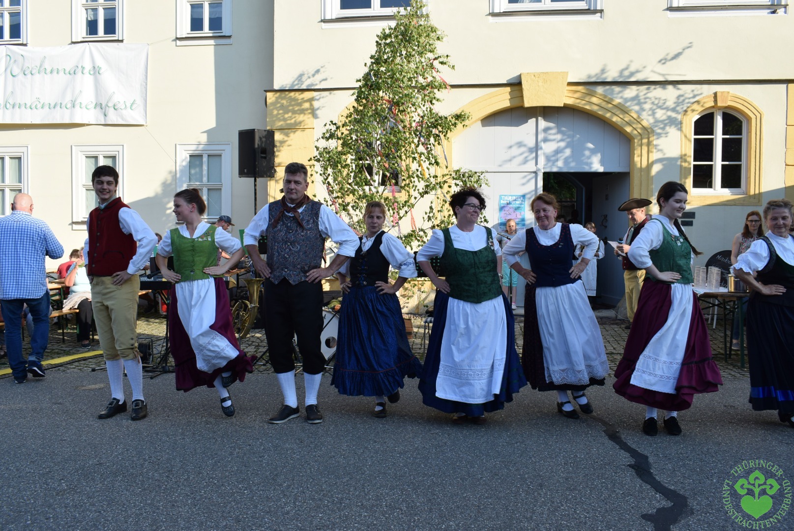 Ja, es hat sich herum gesprochen im Dorf, dass das Laubmännchenfest am Pfingstfreitag in Wechmar zu den schönsten Sitten Wechmars im Jahresverlauf gehört. Zu hunderten strömten die Gäste aus Nah und Fern, sogar aus Australien, auf den Platz vor dem Landhaus Studnitz, wo die Wölfiser Kapelle „Heidn Durscht“ mit fröhlicher Blasmusik aufspielte.