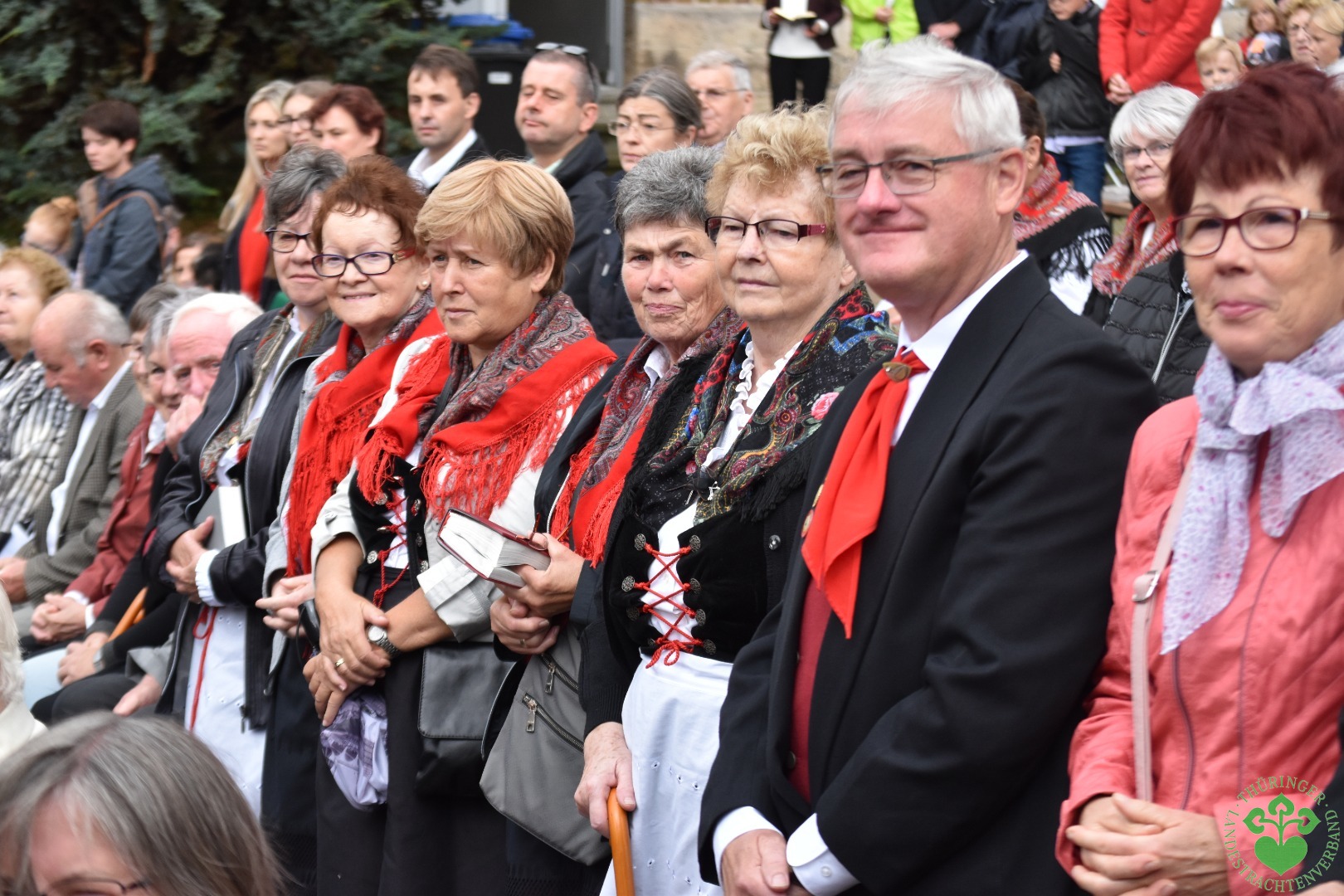 Vereinschef Gerhard Wegerich und Frauen vom Eichsfelder Heimat- und WandervereinHüpstedt verfolgen den Festgottesdienst.