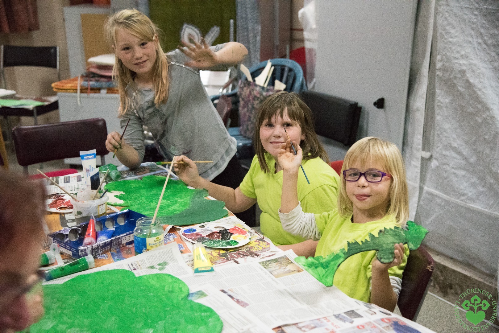 Ganz schön altbacken, eine Arbeit mit Sperrholz und Laubsäge? Doch irgendwie musste der Baum der Thüringer Mundarten doch entstehen. Wie würden die Kinder es aufnehmen, handwerklich tätig zu sein? Ja, es war verblüffend, wie sich die Truppe von 6 bis 14 Jahren schon auf die Entwurfszeichnungen konzentrierte. Lindenblätter, Kastanienblätter, Eichenblätter. Anschließend ging es an die Übertragung der Skizzen aufs Sperrholz, und die Sägeblätter ritten ohne Klage und mit freudigen Bedienern bis in den späten Abend durch das Rohmaterial. Echte Herausforderungen wurden bewältigt. Am Ende erwiesen sich die mitfahrenden Betreuer die Handwerker für´s Grobe: Als die Trachtenkinder sich mit den letzten Fotos für den Mundartkalender abmühten, krempelten sich Muttis und Betreuer die Ärmel hoch und jagten die Sägeblätter mit Elan durch die letzten Bestandteile der Baumkrone. Hut ab!