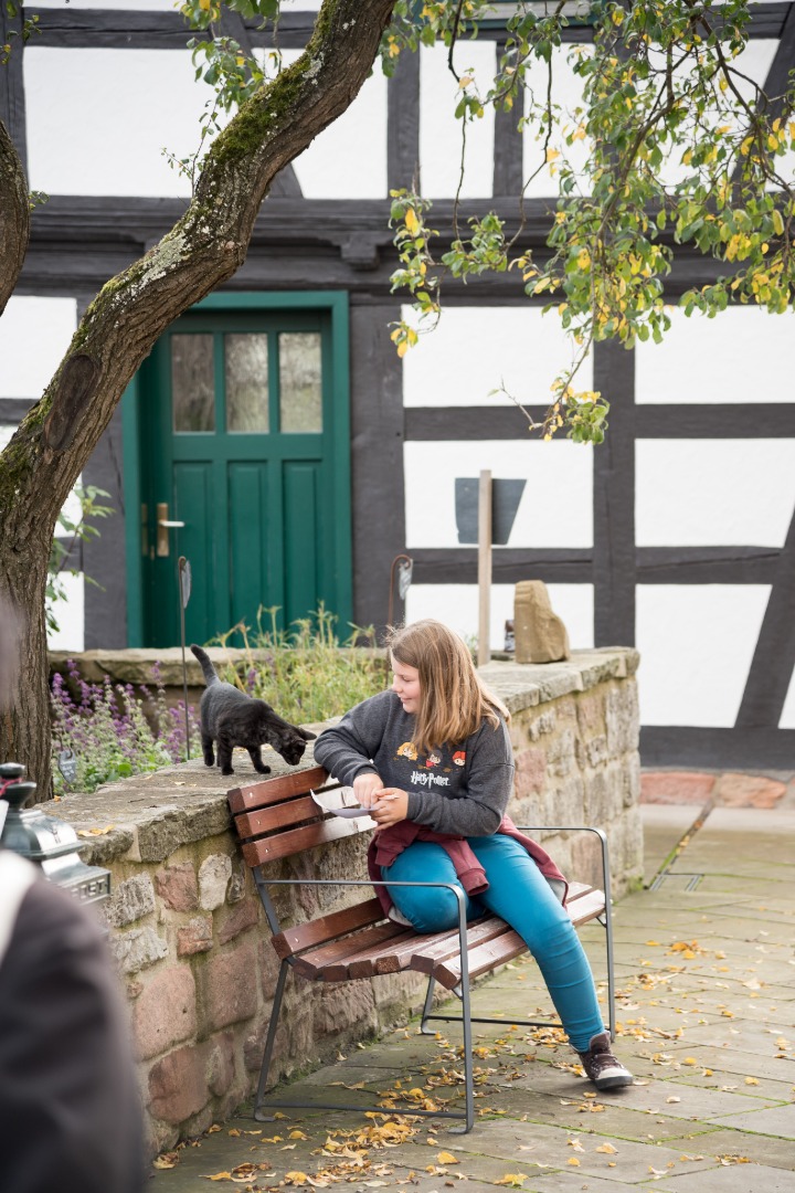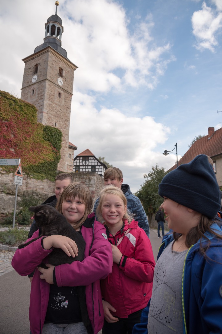 Zwerg Nase, die Figur von Wilhelm Hauff, Rotkäppchen und der Wolf, Aschenputtel, Dornröschen und das listige Rumpelstilzchen. Gleich vor der Sandsteinhöhle wartete Schnurri schon wieder und ging ein Stück Weg mit zur alten Kirchenburg. Kreuzscharten, querliegende Schießscharten und Schalentürme zogen in der Erlebniskirchenburg Walldorf die Aufmerksamkeit auf sich. Gerlinde aus Mosbach konnte sich noch an die erschreckenden Radiomeldungen von vor Ostern 2012 erinnern: „Die Kirchenburg Walldorf steht in Flammen!“ Dabei wurde das Wahrzeichen bis auf die Außenmauern zerstört. Jetzt, nach sieben Jahren, grüßt der Kirchturm wieder stolz ins Werraland. Eine Kletterwand lädt ein, Aussichtspunkte wurden in den Schalentürmen der Umwehrung errichtet, die Kirche mit ihren neugestalteten Glasfenstern stellt eine gekonnte Mischung zwischen Historie und Gegenwart dar. Auf der Kirchenburg stieß auch wieder Schnurri vom Bahnhof zu uns und schmuste ausgiebig mit den Kindern? „Dürfen wir die mitnehmen?“ „Nein, bloß nicht. Die Katze gehört an den Ort, wo sie lebt.“ Es gab schon ein paar Tränen, als Schnurri auf der Außenmauer der Kirchenburg zurückblieb. Aber sie gehört nun mal nach Walldorf.