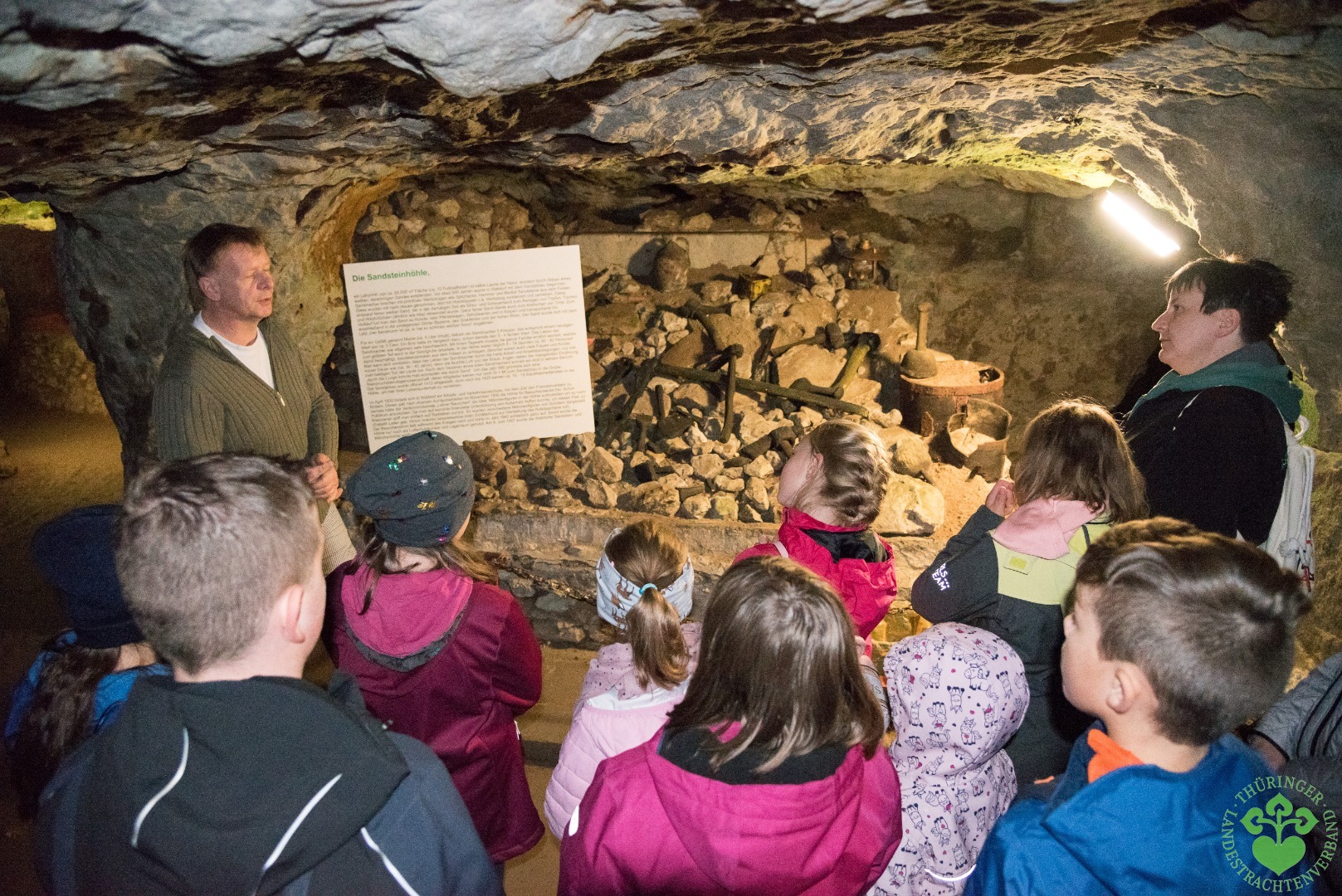 Gleich am Bahnhof von Walldorf hieß eine schwarz-grau getigerte Katze die Feriengruppe der Thüringer Trachtenjugend willkommen. Die Kinder schlossen „ihren“ Stubentiger gleich ans Herz und wollten sich nicht von ihm trennen. Keck folgte das Katzentier über die Werra bis ins Dorf und zur Sandsteinhöhle. Ja, die Märchenhöhle sollte an diesem Tag das erste Ziel sein. So manch einer der mitreisenden Erwachsenen hatte Erinnerungen aus Kindertagen und musste aufpassen, nicht mit dem Kopf an die Höhlendecke zu stoßen. Ja vor 40 Jahren waren viele doch noch etwas kleiner. Aber: Wo bleiben die Märchen? Keine Angst, sie kamen. Die Kinder wussten sogar, die Darstellungen zuzuordnen.