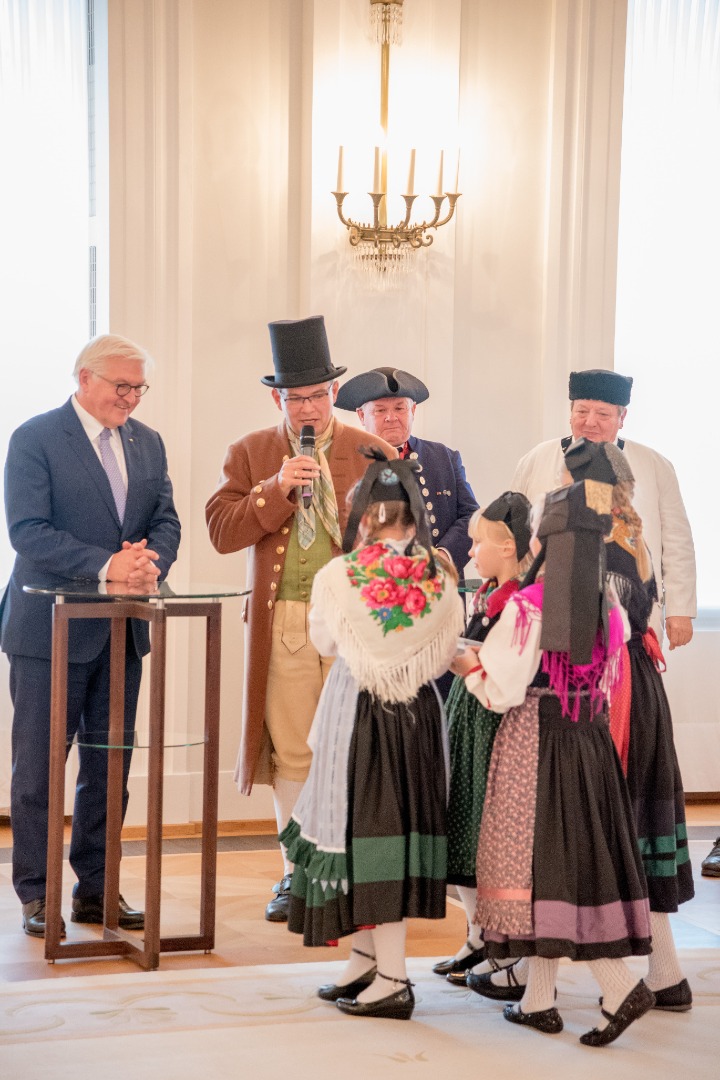 „Ich bin nicht zum ersten Mal mit Alphörnern begrüßt worden, aber zum ersten Mal ganz sicherlich hier im Schloss Bellevue. Deshalb ganz herzlichen Dank für diese schöne alpine Tradition in großer Lautstärke, wie wir sie gerade gehört haben, und so harmonisch dazu.“ So beginnt Frank-Walter Steinmeier seine Rede. Er drückt aus, wie fasziniert er von den bunten Trachten, der Heimatpflege und dem Engagement der Jugend ist. Knut Kreuch, Chef des Deutschen Trachtenverbandes, erwidert gekonnt in Reimen. Auch das ist eine schöne Tradition im Trachtenwesen.