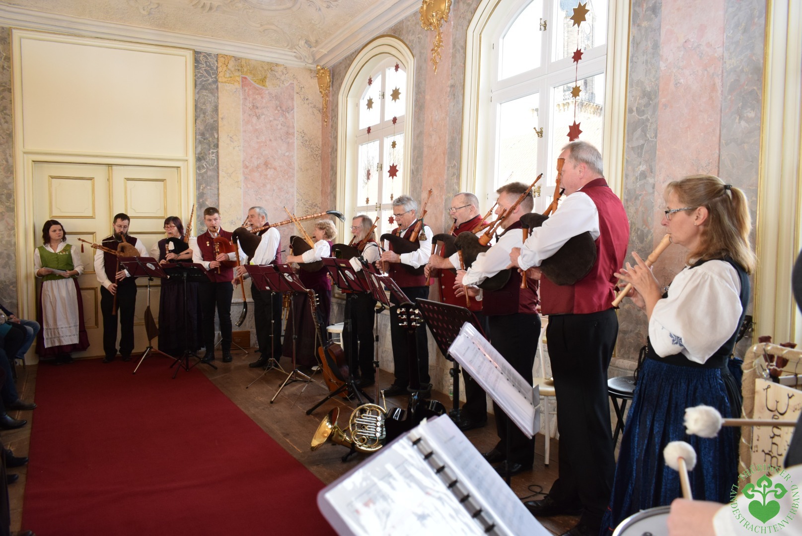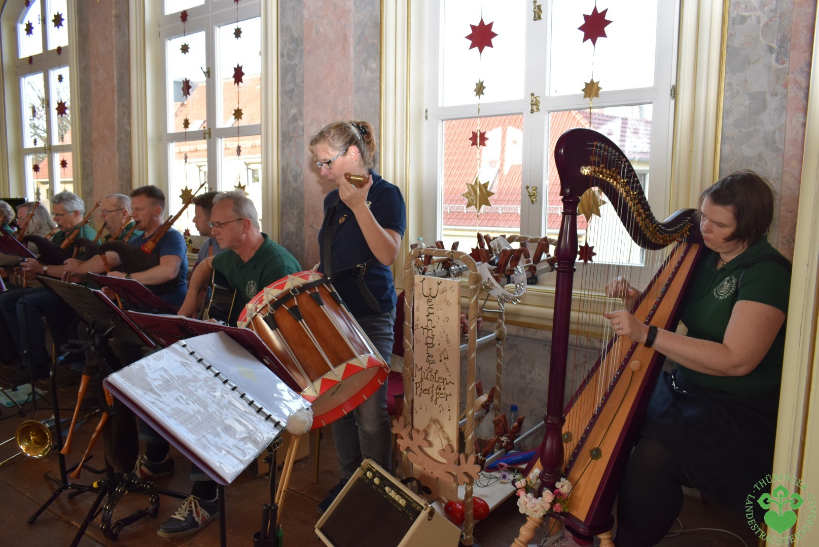 Auch der imposant aussehende Praetorius Bock, die Harfe, Flöten, Tenorflöten und das kleine Gemshorn kamen wieder zum Einsatz. Nicht zu vergessen die Gitarren und die Trompete.
