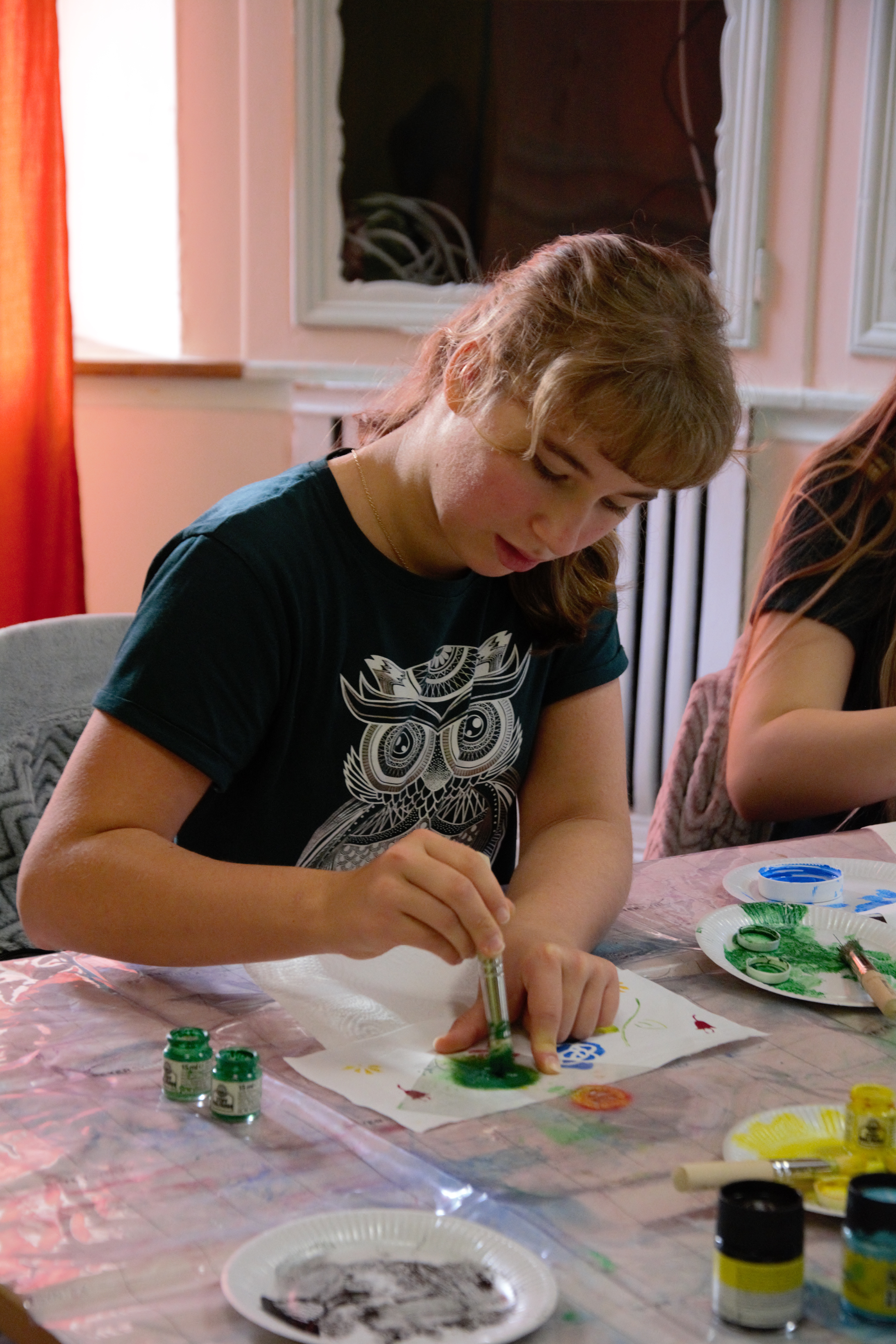 Der Bereich des Textilen spielte in der ganzen Woche eine große Rolle, dafür waren verschiedene Referenten angereist. Ruth Fiedler vom Fachverband Textil e.V. führte die Kinder durch verschiedene textile Arbeiten, z.B. Schablonieren, Drucken und Frottieren. „Frottieren“ bedeutet das Abreiben von Strukturen, was die Kinder an den Architekturen in Erfurts Altstadt emsig praktizierten. Die Zusammenarbeit mit Familie Fiedler kam über die Ausstellung zu Eduard Fiedler zusammen, der Großvater von Klaus-Jürgen Fiedler. Eduard Fiedler war als Maler der Wachsenburg 2018 Thema einer viel beachteten Ausstellung des Thüringer Landestrachtenverbandes im Landhaus Studnitz in Wechmar.