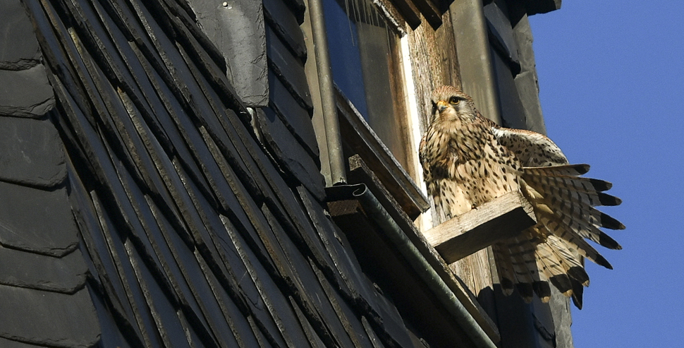 Der Wechmarer Kirchturm gehört den Turmfalken, die ich schon seit meiner Kindheit kenne, wie sie täglich den Turm umkreisen und ihre Brut aufziehen. Der Kirchturm ist ihr zu Hause, so wie er Heimat für das ganze Dorf ist. Die Vögel erkannten eine Gefahr und waren sofort bereit ihr zu Hause, ihre Heimat gegen den vermutlichen Feind zu verteidigen.