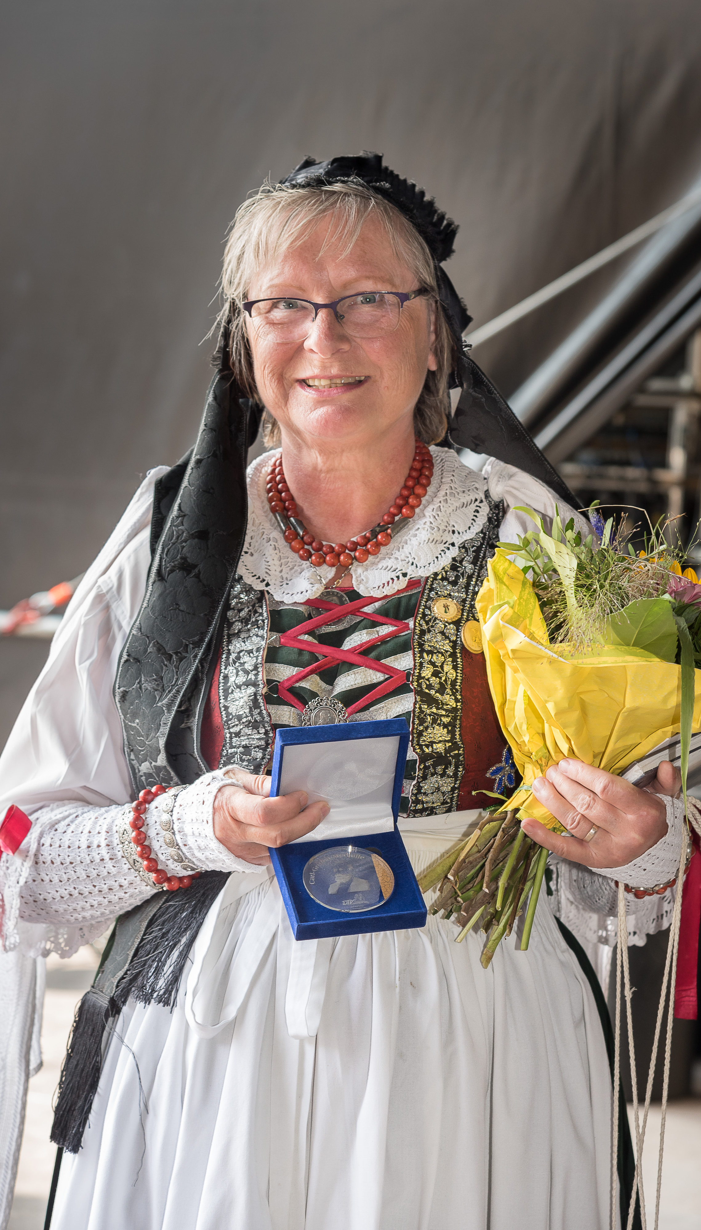 Mit der Carl-Grübel-Medaille in Bronze ehrt der Deutsche Trachtenverband e.V. Bettina Grübel vom Trachtenverein Tabarz e.V. für ihr Lebenswerk in der Heimat- und Trachtenpflege.