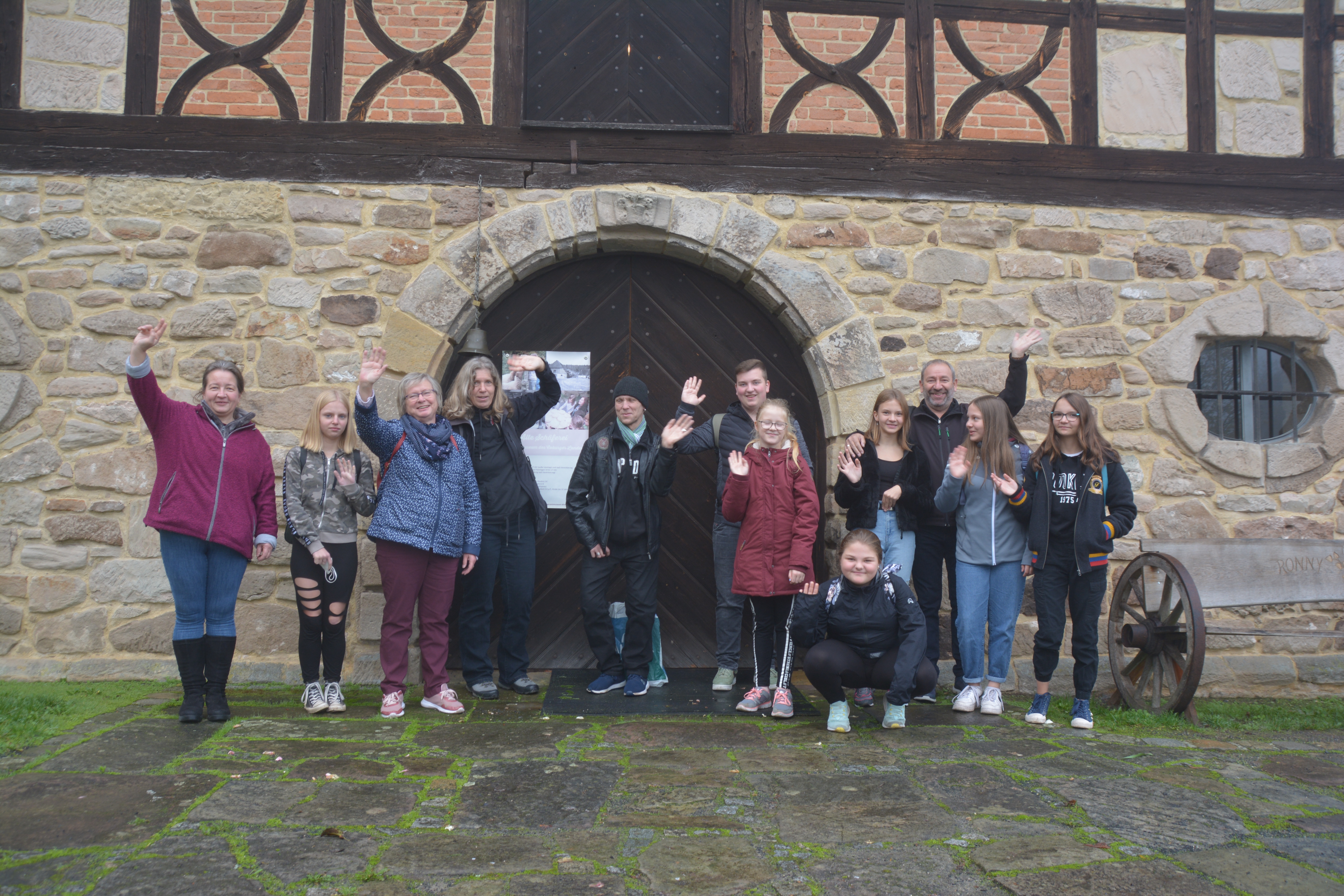 Die Beziehungen der Thüringer Trachtenbewegung laufen allein schon durch die Auftritte und Beziehungen der Gruppen und Vereine ins Coburger Land, da alte Handwerkskunst und Traditionen hier wie da Anhänger haben. So kam zum Beispiel Dagmar Scholz vom Gerätemuseum 2014 zum Wettspinnen nach Suhl und so entstand die Zusammenarbeit mit dem Gerätemuseum des Coburger Landes, mit dem die Thüringer Trachtenbewegung drei sehr erfolgreiche Wettspinnen ausrichtete. Daran erinnerte sich Simone Metzner vom Ahorner Museum, als sie die Feriengruppe der Thüringer Trachtenjugend durch das Objekt und die aktuelle Ausstellung um den Apfel führte. Ein Gemeinschaftsbild entstand vor dem historischen Schafhaus mit dem tollen Zierfachwerk, vor dem einst die Wettspinnerinnen zum Gruppenfoto Aufstellung nahmen.