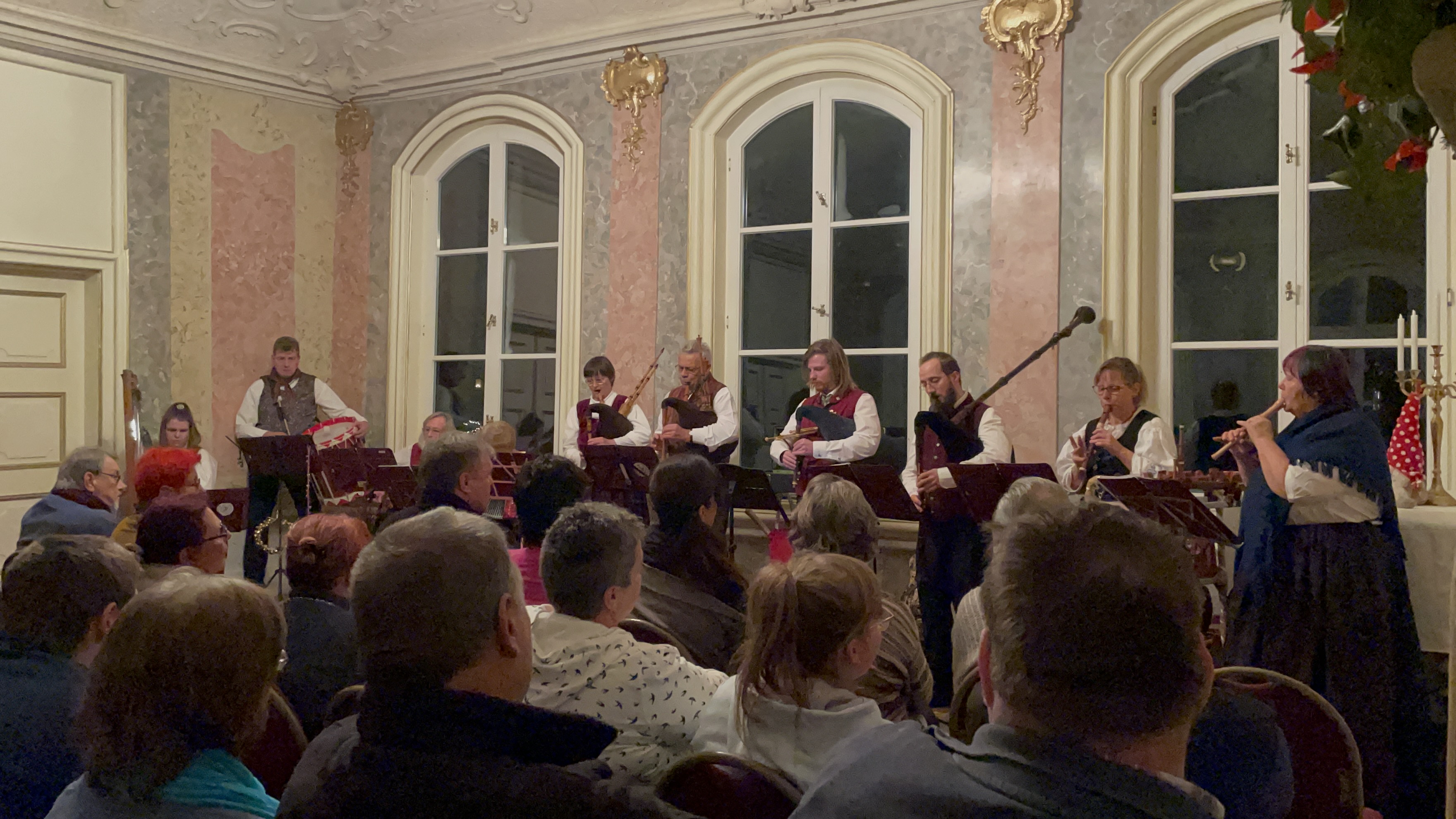 Die Zeit aber rückte gnadenlos voran. Noch mussten ein paar letzte Vorbereitungen getroffen werden, Die Gäste sollten es ja gemütlich, warm und eine gute Sicht auf alles haben. In unseren festlichen Trachten warteten wir zappelig auf unseren Auftritt, während sich der Rokokosaal mit Gästen füllte. Und los ging es. Die Moderation übernahm unser Arno Küch aus dem Hessischen Lande. Mit gekonnt gespielter Zerstreutheit führte er das Publikum und auch uns lustig durch das Programm.