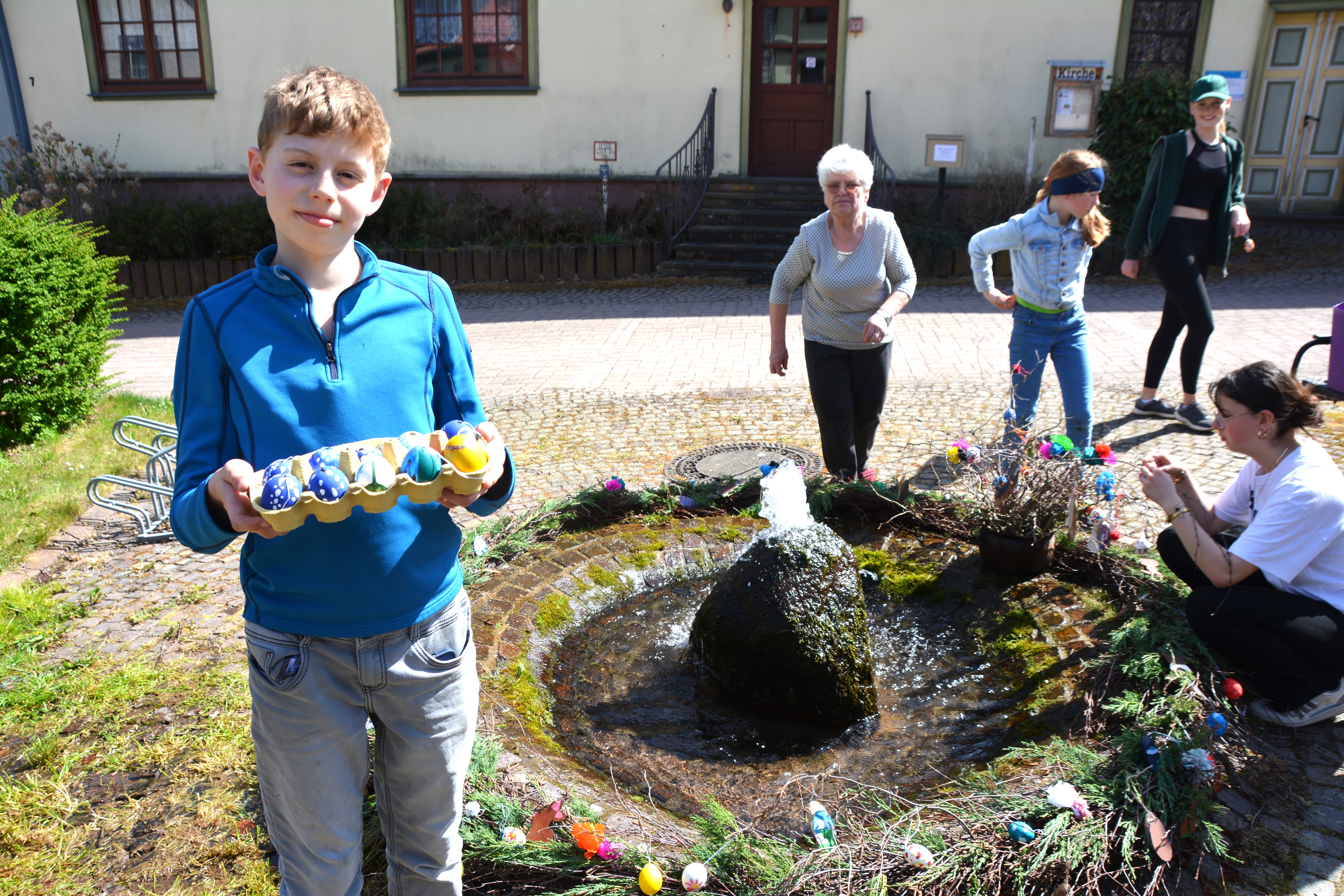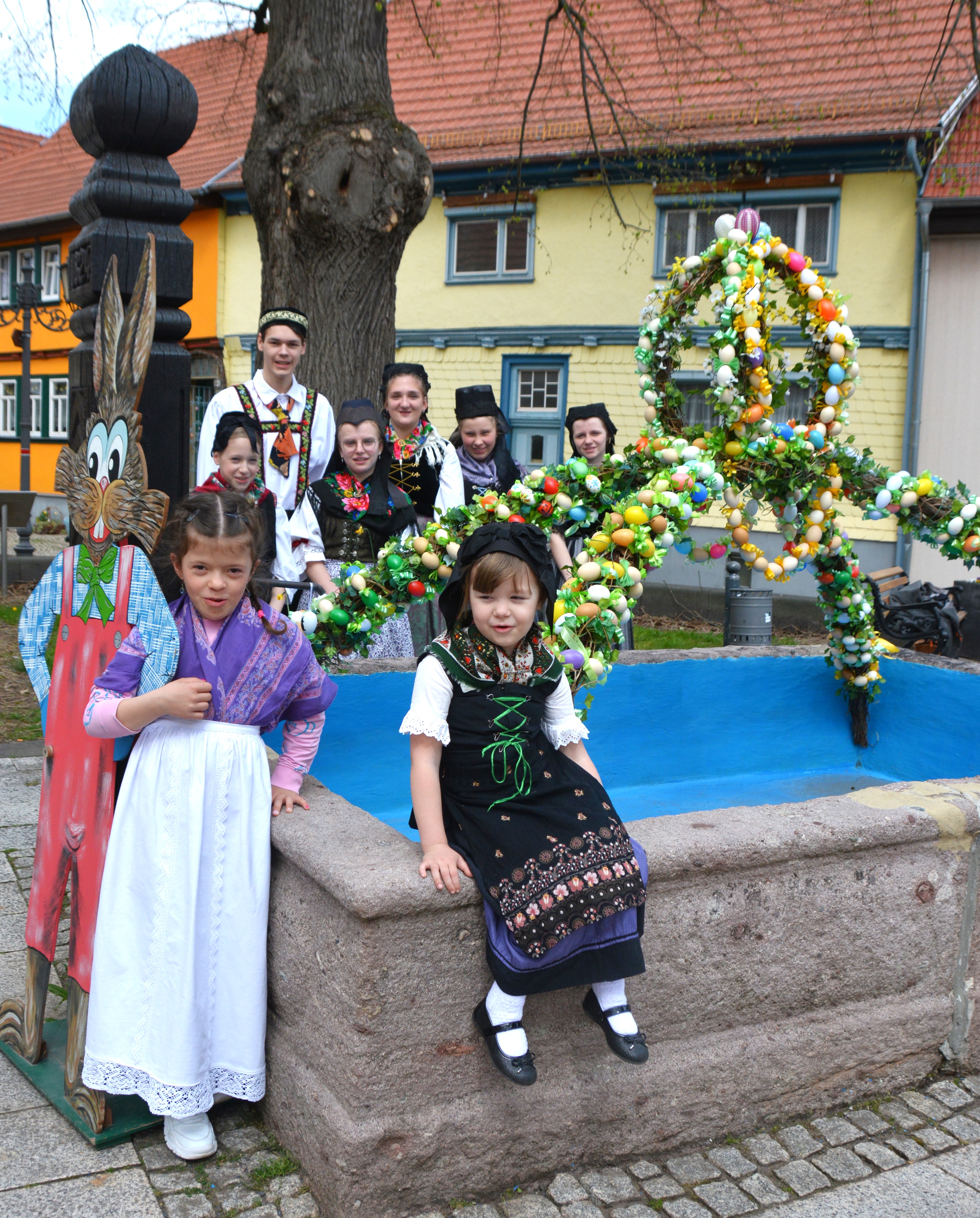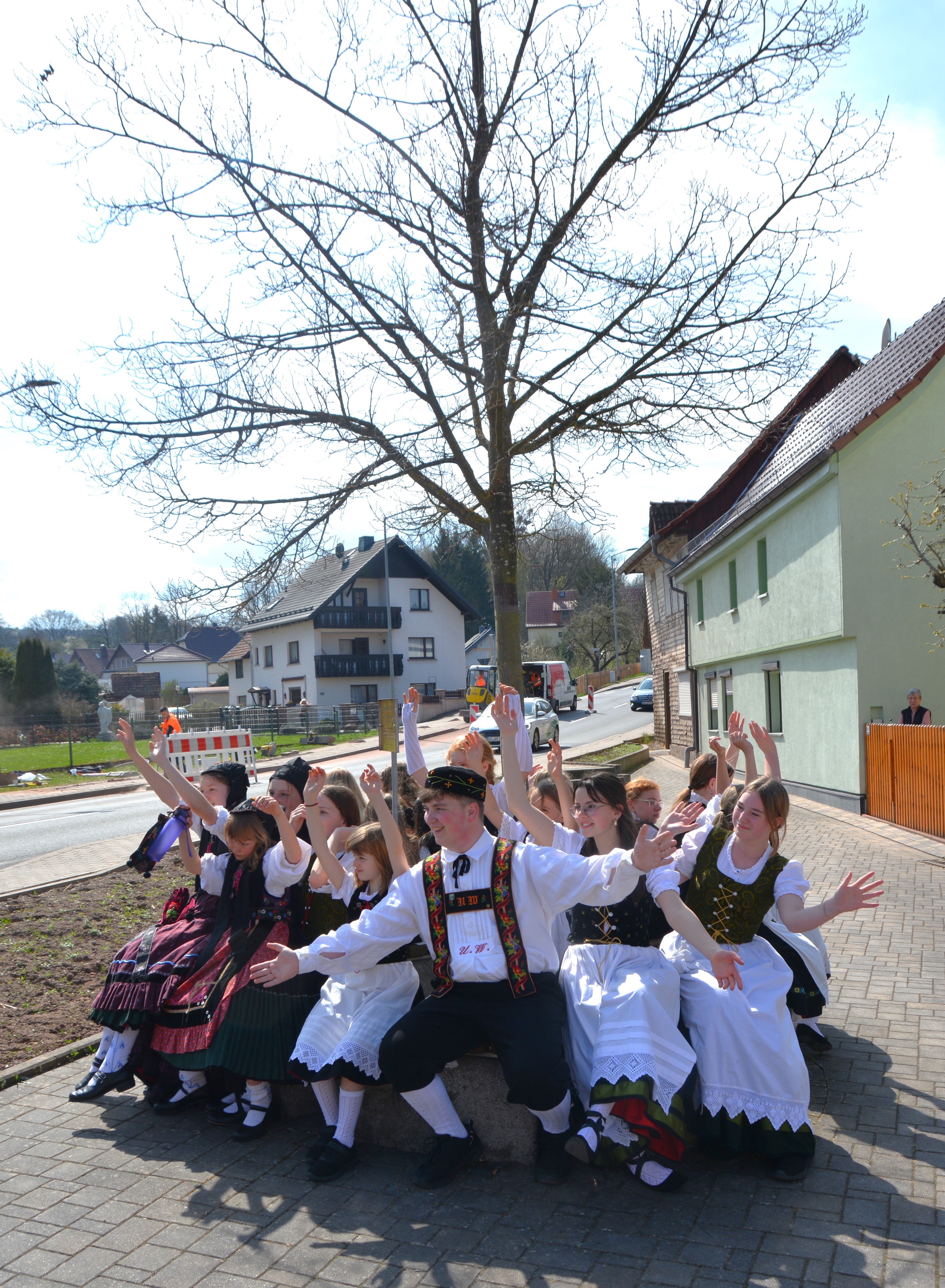 Die festliche Übergabe der Osterbrunnen in Engelsbach zum Abschluss der Osterferienaktion gestaltete sich zum Höhepunkt, zu dem zahlreiche Zuschauer anwesend waren. Selbst das Thüringenjournal des MDR ließ es sich nicht nehmen, einen kleinen Beitrag zu drehen und am Abend zu senden (siehe hier ab Minute 10:53). Die Presse war auch vor Ort und bracht.tolle Bilder unserer Aktion in die Wochenendausgabe. Mit einer Tanzfolge der Thüringer Trachtenjugend, wie immer einstudiert von Jürgen Schiecke, erhielt alles den richtigen feierlichen Charakter. Danach konnten die Kinder und Jugendlichen ihre Bastelprodukte an den Brunnen wiederfinden. Die Arbeit hat sich gelohnt!