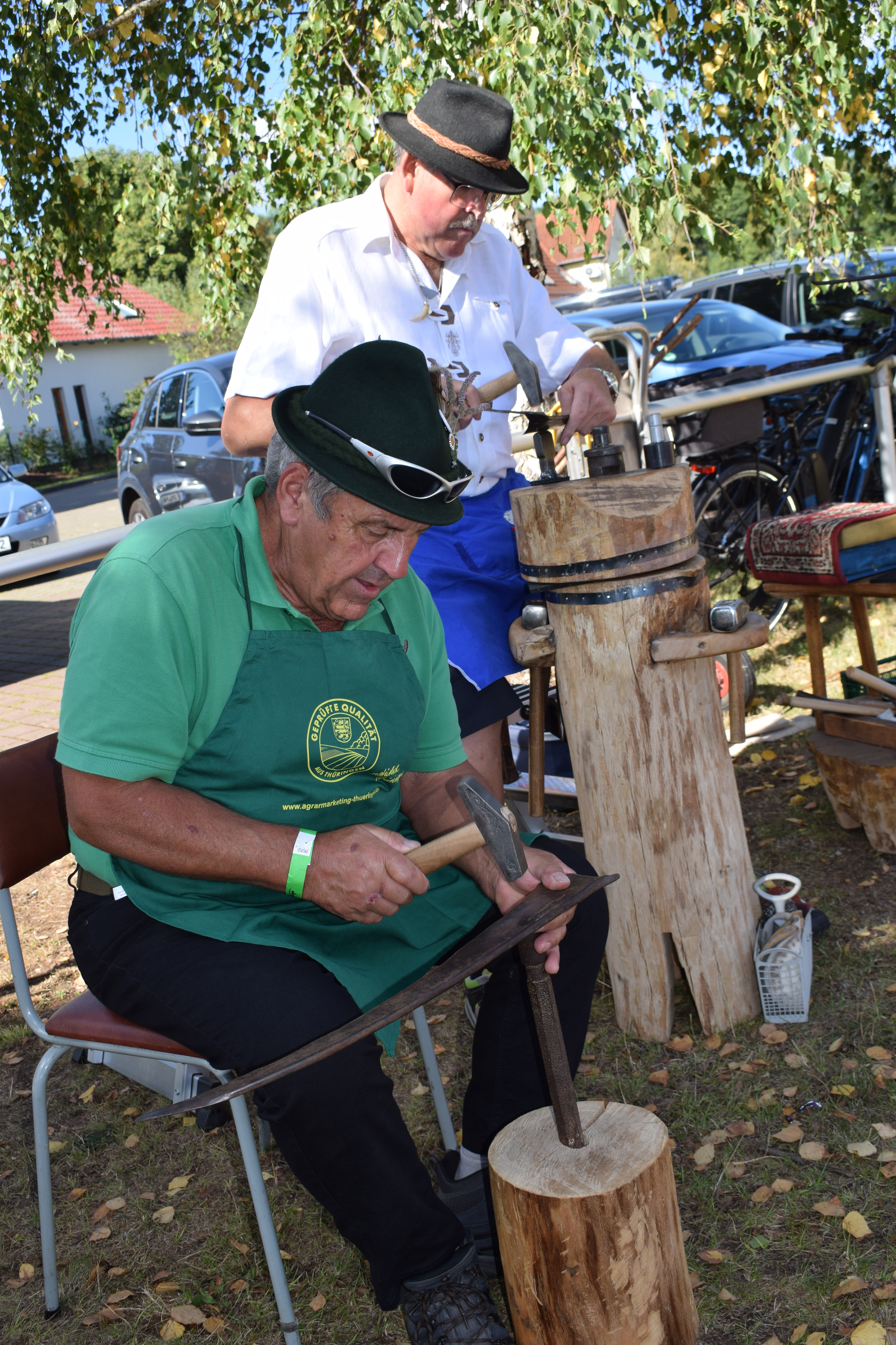 Auch im Außenbereich gab es Spannendes zu entdecken: Dort zeigten Dengler, wie man eine Sense richtig beschlägt. Mit Hammer und Amboss wurde die Schneide des Sensenblatts fachmännisch ausgedünnt („ge dengelt“) und anschließend mit dem Wetzstein nachgeschärft. Diese Handwerkskunst faszinierte viele Gäste und verdeutlichte eindrucksvoll, wie wichtig früher die Pflege von Werkzeugen für die Landwirtschaft war.