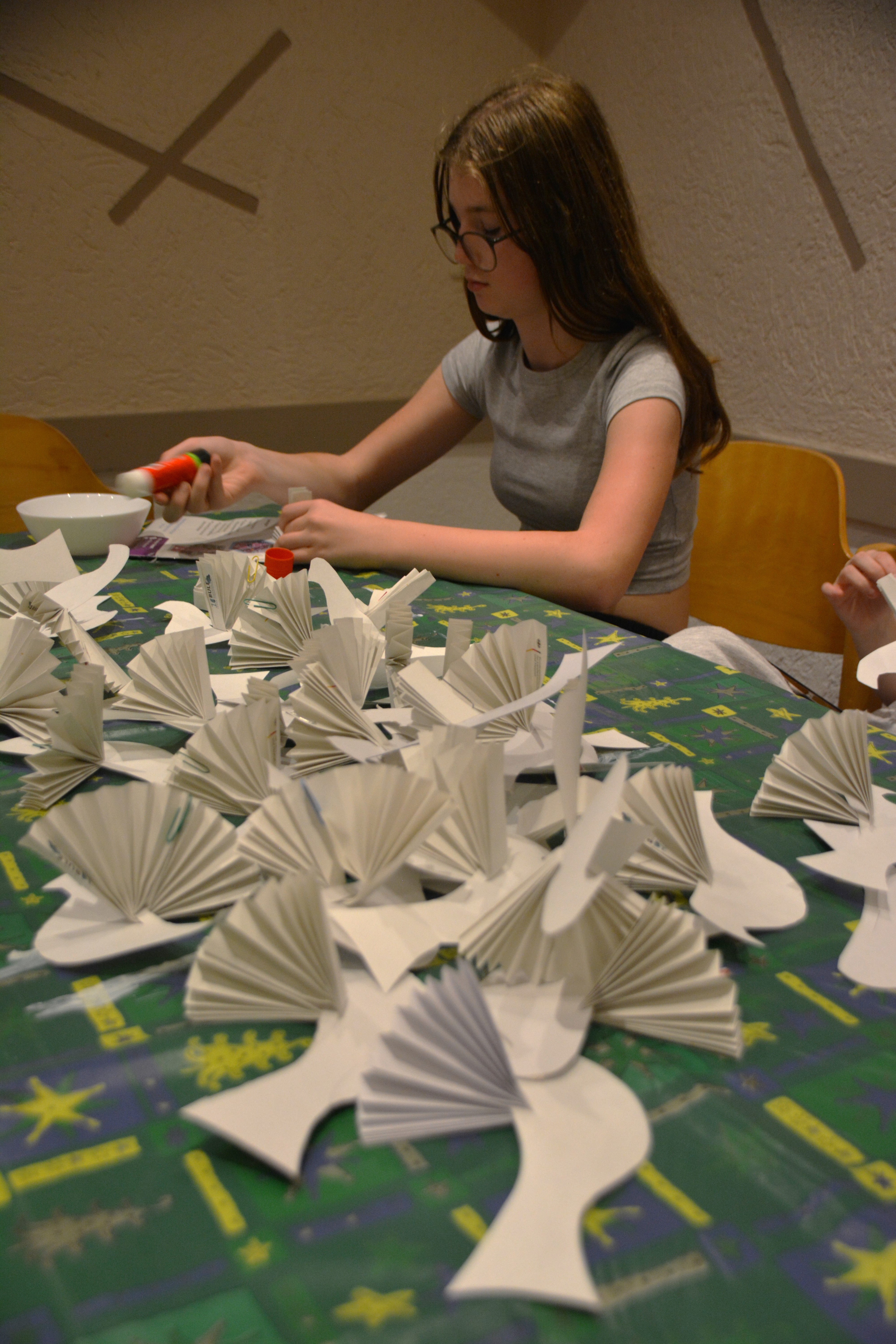Es ging jedoch nicht nur um Ausflüge in die Region, die Trachtenjugend setzte wichtige Vorhaben fort. Zum Beispiel das Projekt FRIEDEN: Gestern, Heute & Morgen, an dem die sie beteiligt ist. Dafür wurden eine Menge Friedenstauben gefaltet, die zum Projekttag Ende Oktober in Altenburg den Veranstaltungsraum schmückten. Vorher hatte Tanzleiter Jürgen im Rittersaal noch mit allen Tänzern an der Tanzfolge der Thüringer Trachtenjugend gearbeitet.