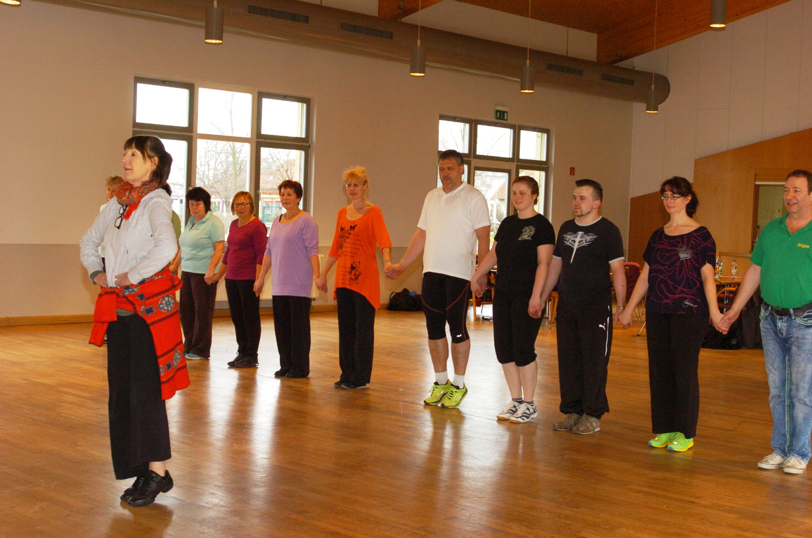 Manchmal wird die Pause herbeigesehnt. Denn ein Tanzleiterseminar erfordert Konzentration und baut Kalorien ab. Maud Butter achtet immer wiedere ganz genau darauf, dass alle mitmachen und die Schritte richtig setzen. „Besonders die doppelte Federung muss daheim noch geübt werden.“, so stellte sie kritisch fest. Für die Teilnehmer ist das ein Ansporn. In das Bürgerhaus der Gemeinde Günthersleben-Wechmar zog es diesmal an die 20 Teilnehmer, unter anderem aus Wallrabs, Wechmar, Dachwig, Tambach-Dietharz, Dingelstädt, Mengersgereuth-Hämmern, Brotterode, Mosbach und von der Grabfelder Kindertrachtentanzgruppe Behrungen. „Der lange Anreiseweg lohnt sich immer!“, so waren sich alle einig. Die Vorbereitung des Seminars lag wie alle Jahre in den bewährten Händen der Projektmanagerin des Thüringer Landestrachtenverbandes, Eva Kowalewski aus Wechmar.