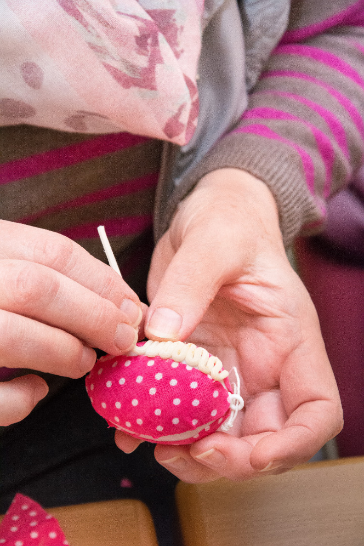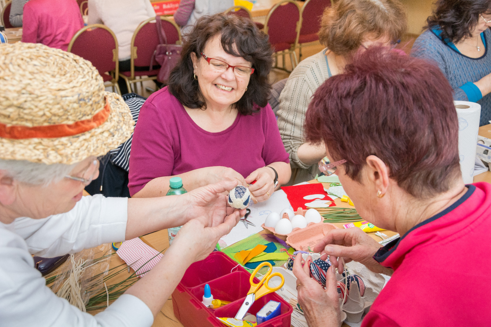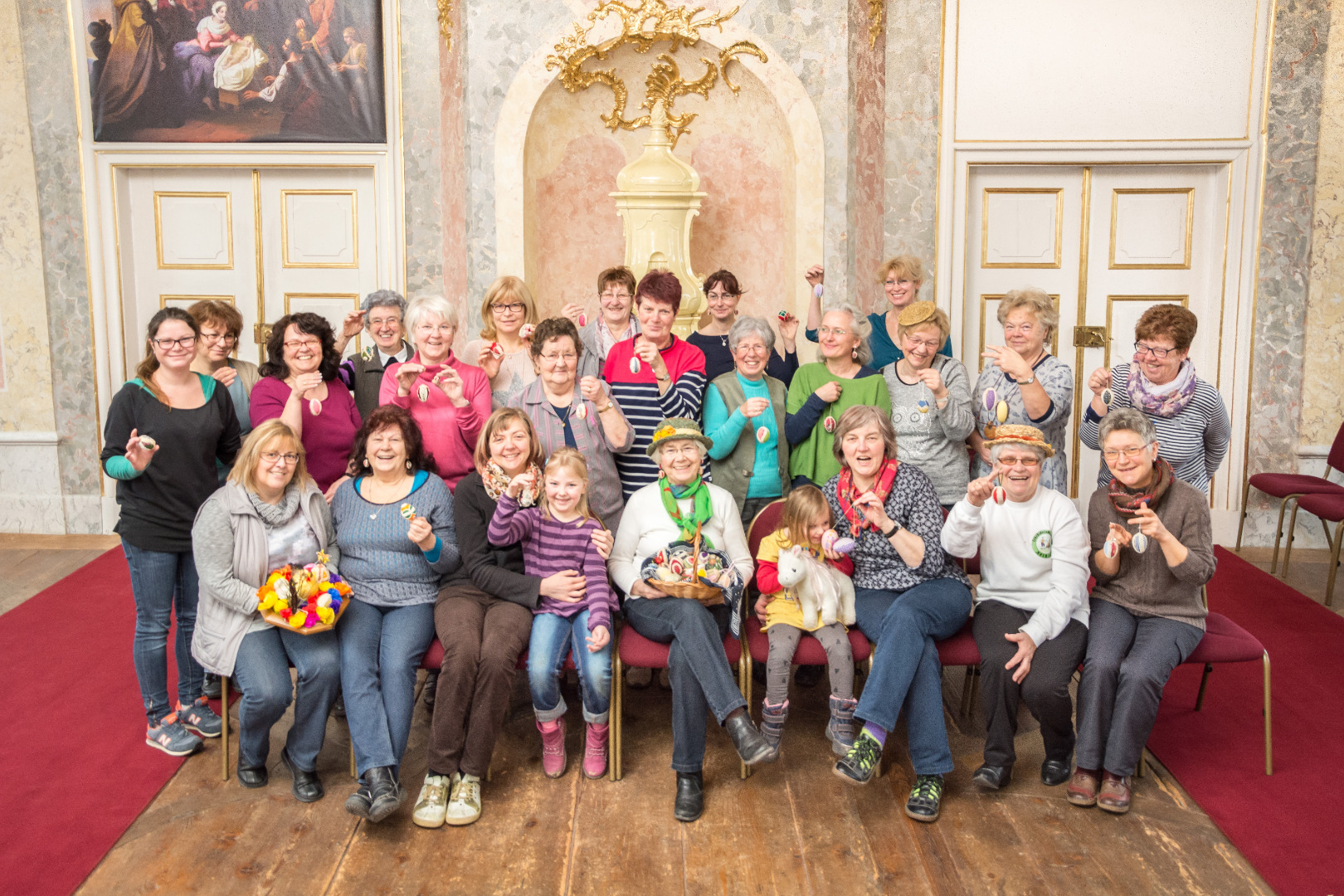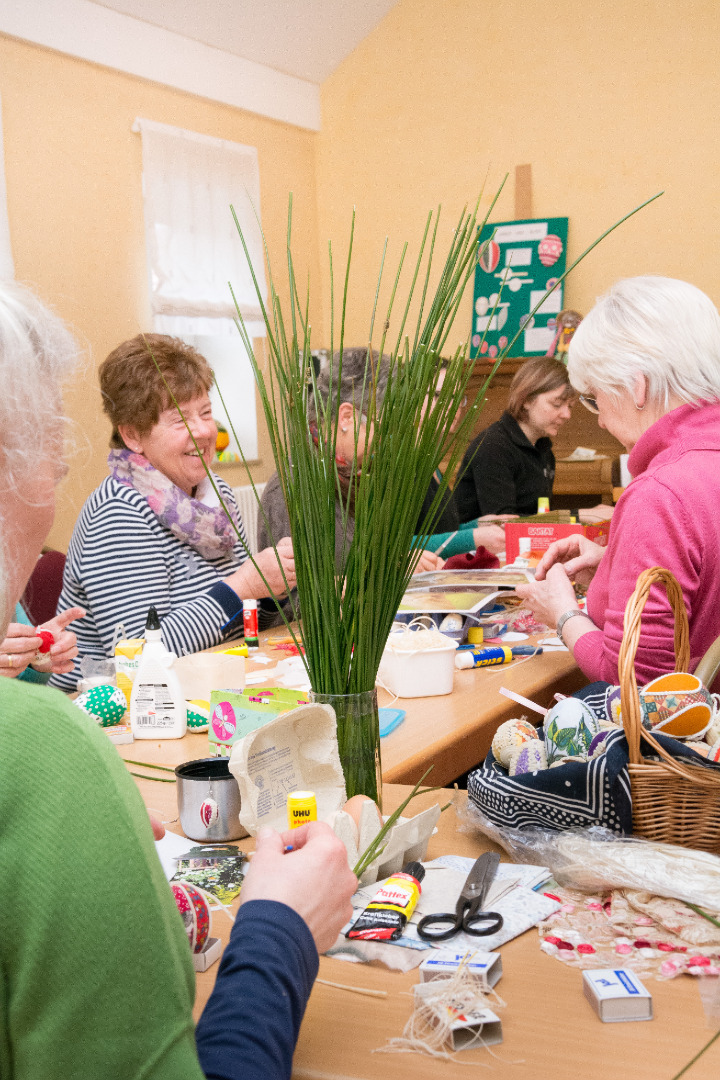 Eva Kowalewski betonte, dass gerade dasSeminar über Binseneier immer wieder viel Aufmerksamkeit erregt und die Teilnehmer anzieht, obwohl es einige Mühe kostet. Dabei kommen nicht allein Mitglieder der fast 100 Trachtenvereine, die es im Freistaat gibt, sondern auch viele Interessierte . „Diesmal waren Günthersleben-Wechmar, Waltershausen, Friemar, Mosbach, Dachwig, Schwabhausen, Neudietendorf, Erfurt, Eisenach und erstmals 5 Frauen vom Heimatverein Gospenroda mit von der Partie.“, so Eva Kowalewski. Die Gospenrodaer überreichten gleich mal eine Chronik ihres erst 2014 gegründeten Vereins und hatten die Ehre, vom Landesvorsitzenden Knut Kreuch persönlich begrüßt zu werden. Dieser hatte sich ein paar Minuten Zeit genommen, um am Morgen allen fleißigen Bastern einen schönen Tag und tolles Gelingen zu wünschen. Die entstandenen Binseneier konnten sich am Nachmittag sehen lassen und hängen demnächst am einen oder anderen Osterstrauß. Auch winzige Binseneier-Ohrstecker entstanden, die sicher zum Osterfest ein Blickfang am Ohr der Dame des Hauses sein werden.