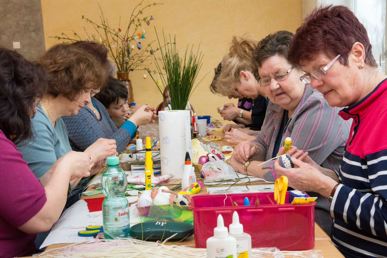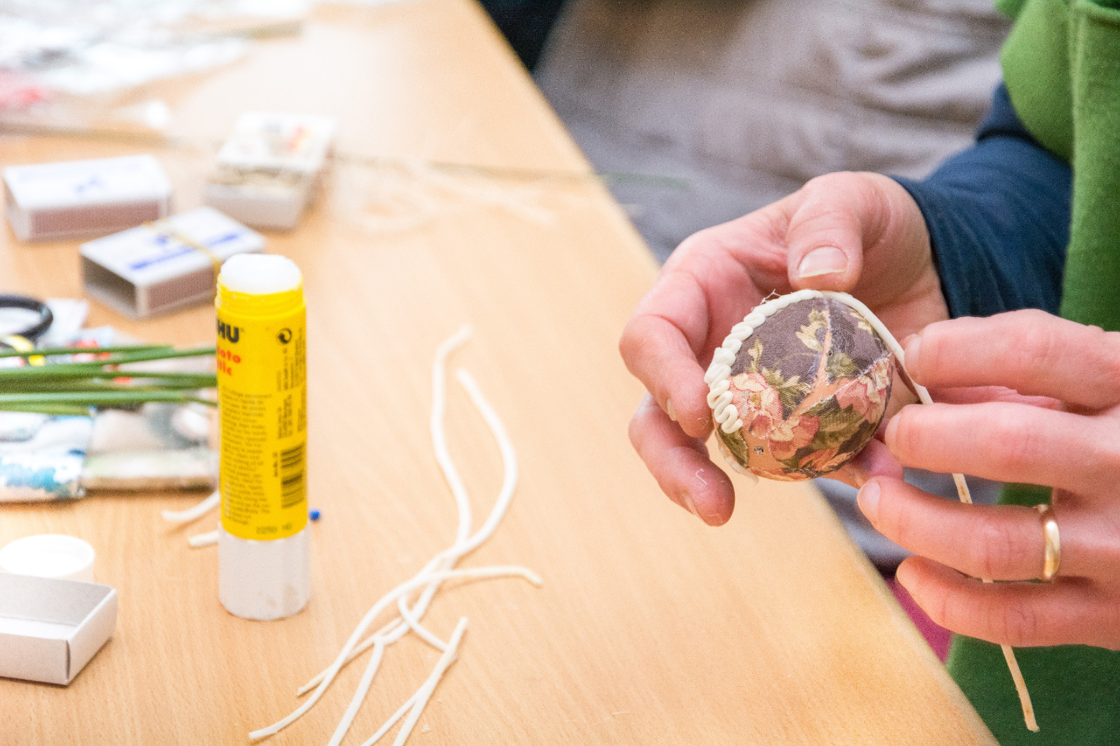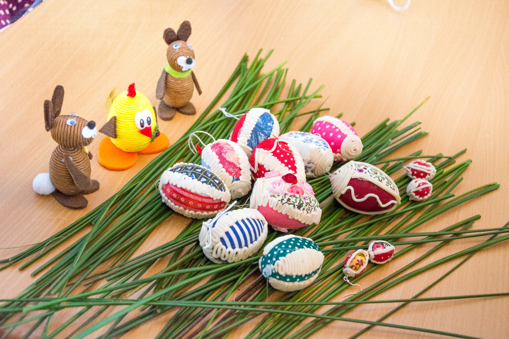 Einige Binseneierbastler hatten kurz vorher den Eisenacher Sommergewinn besucht, zu dem ja die so verzierten Eier als ganz besonderes Schmuckelement dienen. Seit dem Jahre 1823 spricht man bereits von Eiern, die mit „Binsen undLäppchen von verschiedener Farbe belegt“ sind und liefert damit die Ersterwähnung der Eisenacher Binseneier, wie sie heute noch bekannt sind undhergestellt werden. Weitere Verbreitungsgebiete dieses schönen Osterschmucks findet man im Odenwald und in Polen. Verschiedene Traditionsmuster haben ihre Bedeutung und können vom Kundigen wie eine Glückwunschkarte gelesen werden. Punkte und Tropfen bedeuten z.B. das Wasser des Lebens, der Kreis ist Symbol des Alls und der Unendlichkeit. „Doch das ist alles eine Wissenschaft für sich, die man erst mit den Jahren begreift.“, so Karin Schneider.