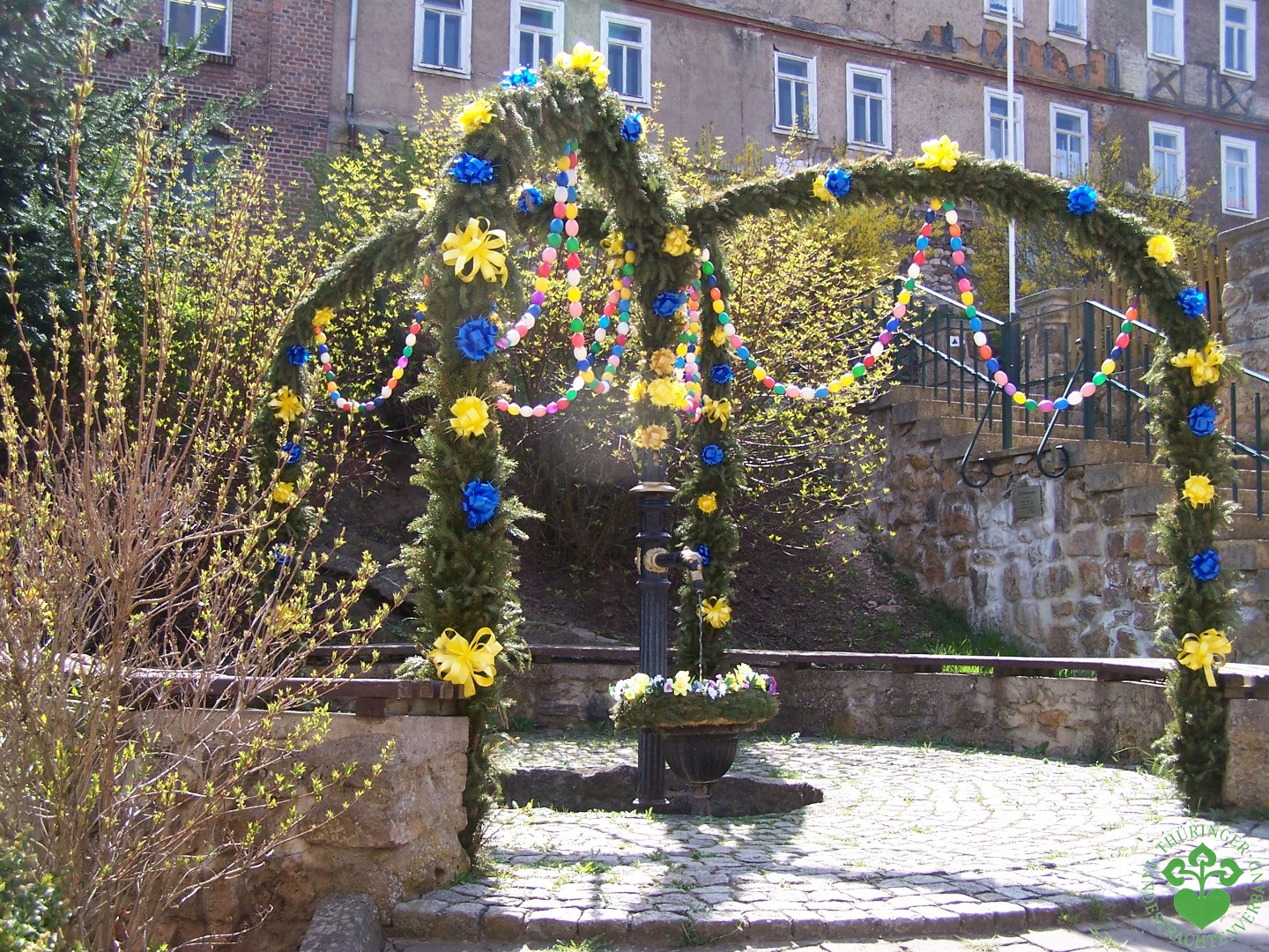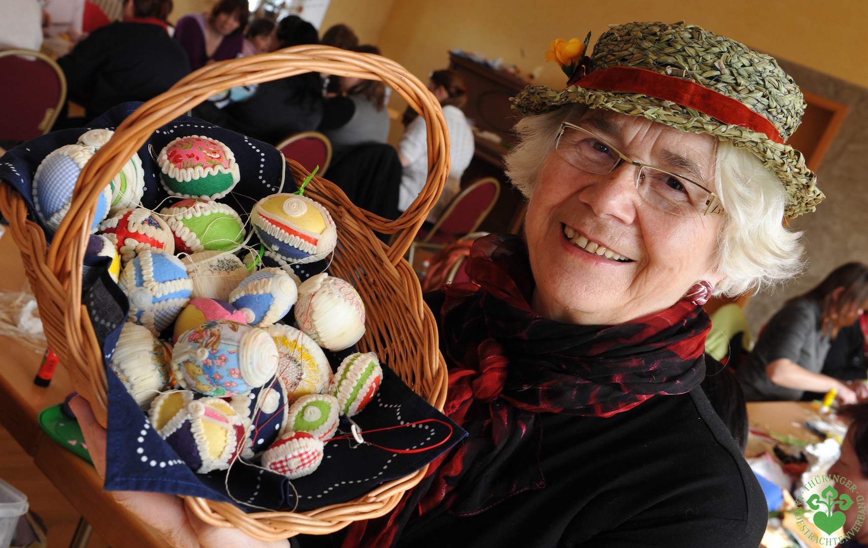 Und was hat nun die Tracht mit dem Ei zu tun? Thüringen ist reich an Traditionen rund ums Ei. So sind es nicht nur die legendären Binseneierseminare von Karin Schneider, die den alten Brauch der Verzierung des Ei`s mit natürlichen Rohstoffen und biologischen Farben weitergeben. Fahre ich durch Thüringen entdecke ich immer wieder zur Oster- und Pfingstzeit mit Eiern und Eierketten geschmückte Brunnen, in Saalfeld steht ein Ostereierbaum und in unseren Kindergärten wird seit den Zeiten von Friedrich Fröbel und August Köhler schon den Kindern gelehrt, wie man mit Farben die weißen Eier in bunte Kunstwerke verwandelt. In der Herzoglichen Kunstkammer des Schlosses Friedenstein zu Gotha bin ich immer wieder verzückt, wenn ich die filigran bearbeiteten Straußeneier des 16. Jahrhunderts bestaune und nur erahnen kann, mit welcher hohen Kunstfertigkeit die meist unbekannten Meister ihre zerbrechlichen Eier ritzten und bemalten. In Tambach-Dietharz betreiben Johanna und Edwin Wawra noch heute eine kleine Straußenfarm, aus der in den letzten Jahren schon viele Eier in kunstfertige Hände des 21.Jahrhunderts übergingen.