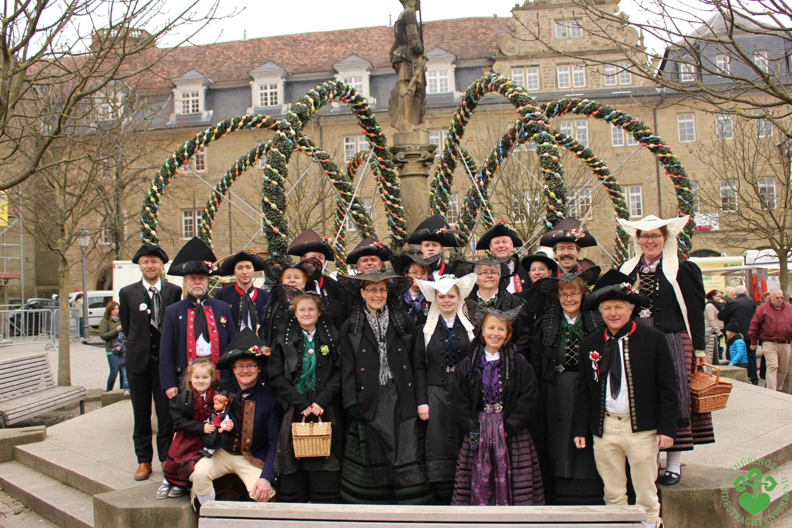 Eifrige Besucher Thüringer Trachtenfeste sind auf jeden Fall schon einmal mit Trachtenfreunden oder Vereinen aus Öhringen in Kontakt gekommen, denn Öhringen ist die Partnerstadt von Ohrdruf am Fuße des Thüringer Waldes. Ohrdruf war Residenz der berühmten Grafen von Gleichen, die in Thüringen vor allem durch die Sage vom zweibeweibten Gleichengrafen bekannt sind.Als das Geschlecht von Gleichen 1631 ausstarb, fielen die Stadt und sechs Dörfer, die meisten in der Umgebung, als Obergrafschaft Gleichen infolge eines Erbvertrags an die Linie Neuenstein der Fürsten von Hohenlohe, zu deren Besitz auch Öhrungen gehörte. Sie unterhielten in Ohrdruf bis 1848 eine Kanzlei und ein Konsistorium. Es gab also über zwei Jahrhunderte enge Kontakte zwischen dem Hohenloher Land und Thüringen. Gleich nach der Wende war es deshalb 1990 ein Anliegen zahlreicher Öhringer Vereine, nach Ohrdruf zu fahren und dort an alte Gemeinsamkeiten anzuknüpfen. Diese bestehen unter anderem zur Interessengemeinschaft Schloss Ehrenstein, die im Thüringer Landestrachtenverband organisiert ist.