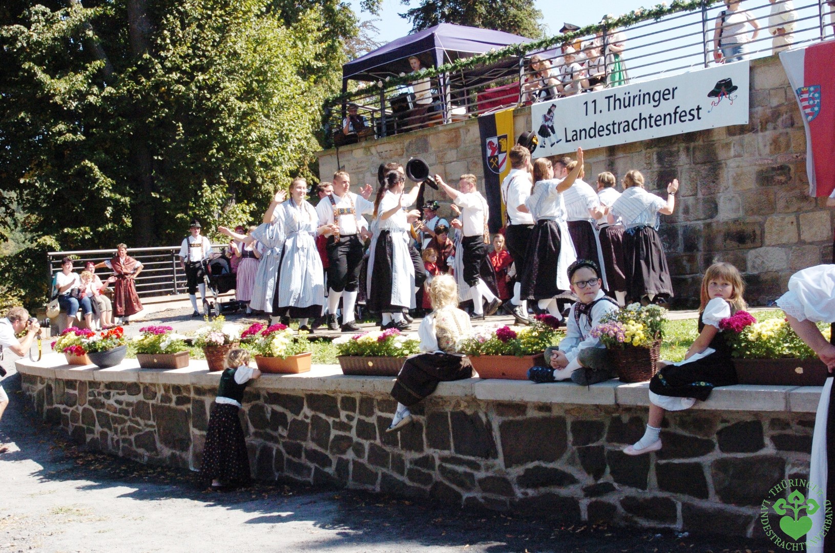 Anneliese Rühle aus Behrungen hatte richtig Lampenfieber. Die versierte Tänzerin hatte schon seit Wochen mit ihrer Grabfelder Kindertanzgruppe die Tänze für´s Fest eingeübt. Für die Kinder war es der erste Auftritt vor so viel Publikum, wie sie betonte. Der Applaus zeigte: Alles hat gut geklappt und ist angekommen. Insgesamt war schon sehr auffällig, wie zahlreich Kinder und Jugendliche das Fest mitgestalteten. Ein gutes Zeichen für die Attraktivität des Thüringer Landestrachtenverbandes und seiner Trachtenjugend. Beim Auftritt der Vogteier Trachtengruppe aus Oberdorla gestalteten die Kinder gar das Hauptprogramm. Es konnten einige Thüringer Gruppen begrüßt werden, die noch nie beim Landestrachtenfest waren, z.B. ein Trachtenpaar mit Weimarischer Haube aus Großneuhausen bei Sömmerda.