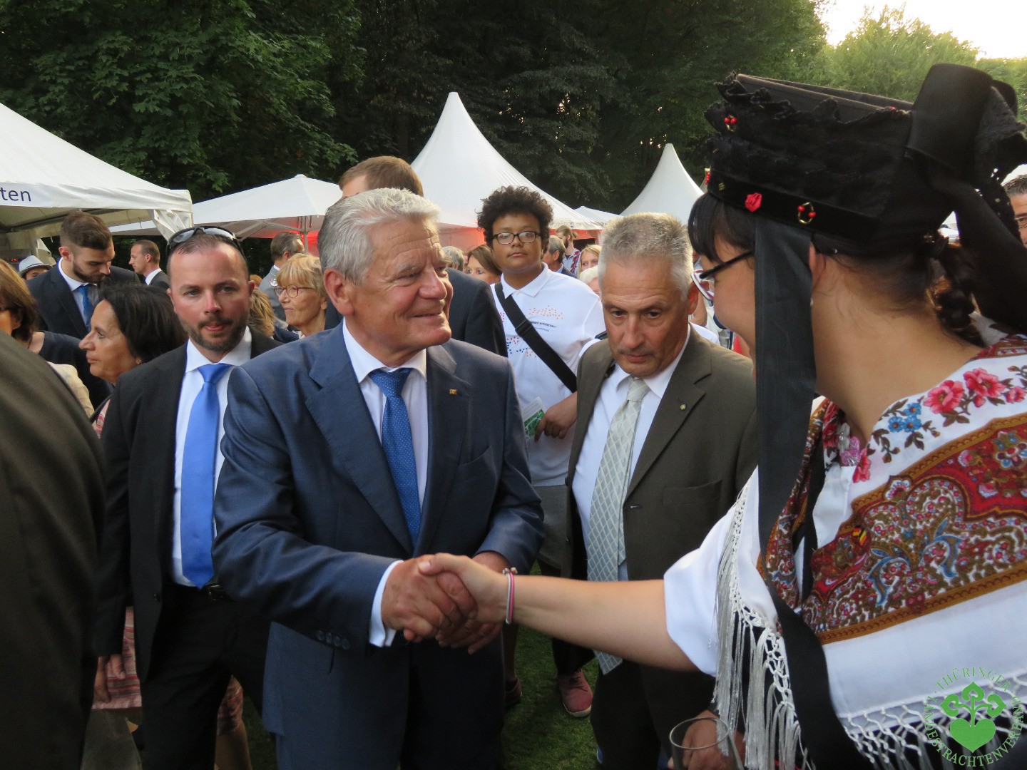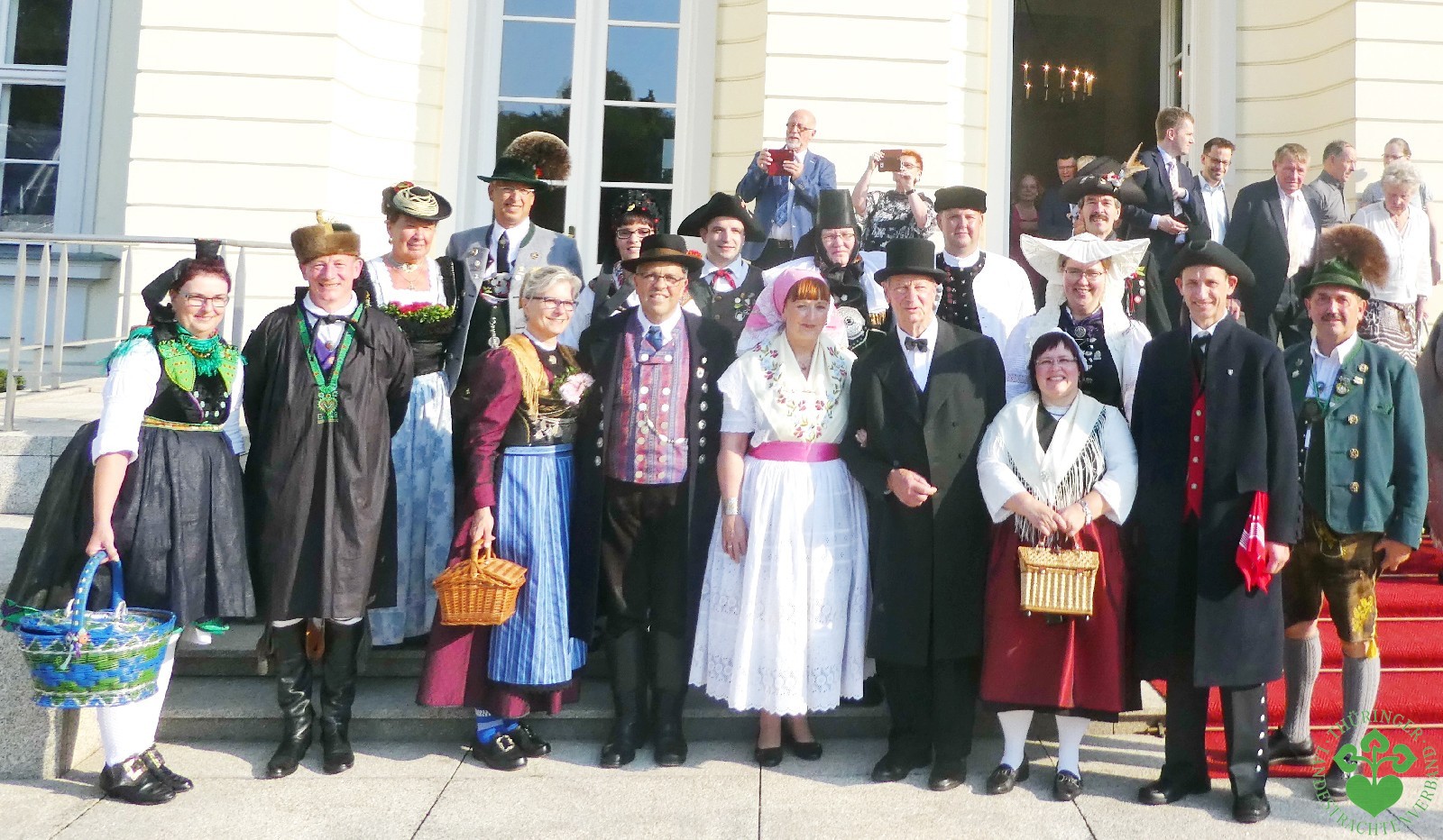 Nach ein paar Leckerbissen und guten Getränken nahmen wir nochmals mit den anderen Trachtenträgern auf dem roten Teppich vor dem Schloss Aufstellung um ein Gruppenfoto mit dem Bundespräsidenten zu machen. Hierbei wollte Herr Gauck mehr über die Trachten und deren Herkunft wissen, er dankte uns allen für unser Kommen und das Engagement, die Tracht auch heute noch mit Stolz und Würde zu tragen und das Erbe unserer Vorfahren aufrecht zu erhalten und fortzuführen.