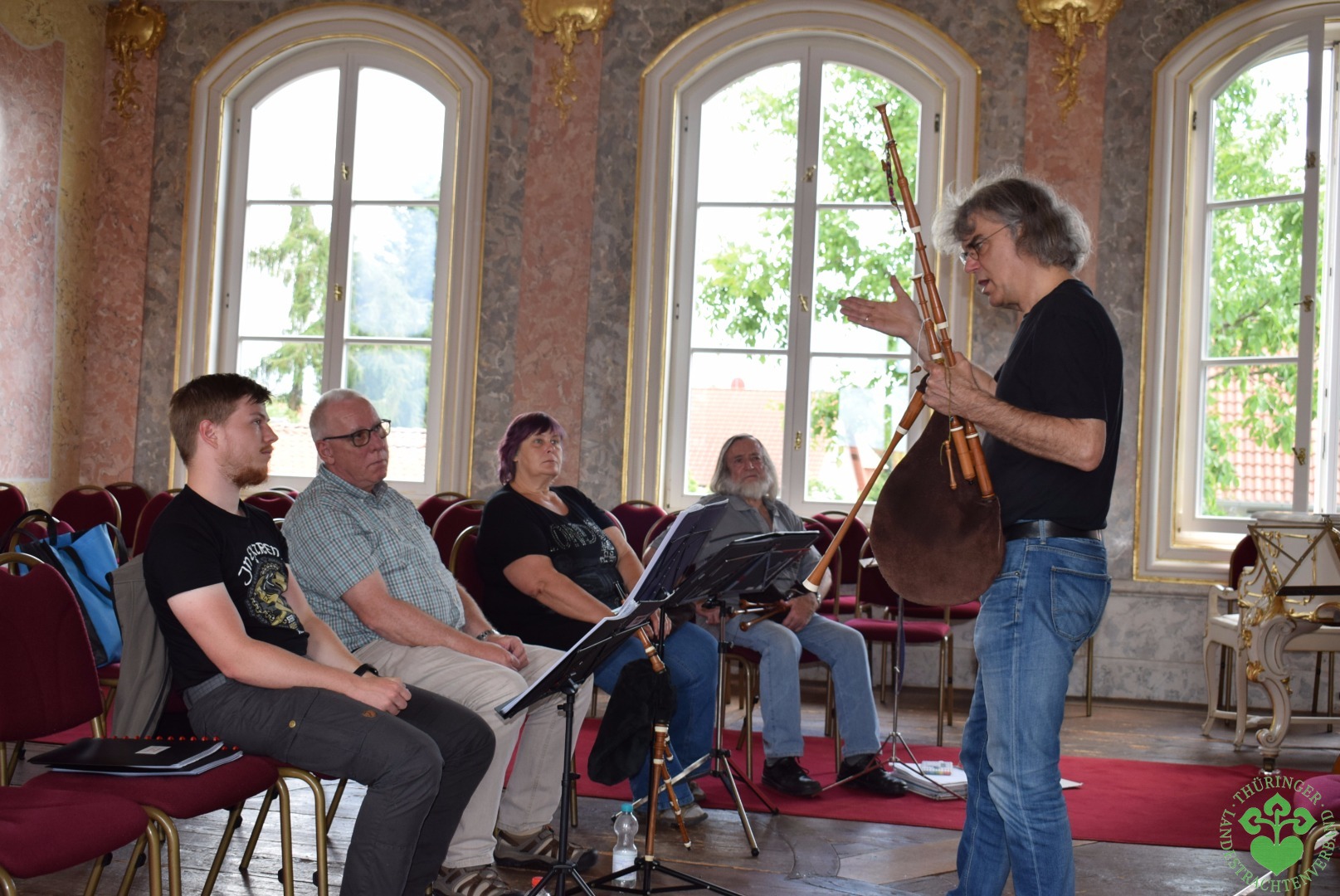 Am Wochenende vom 16. bis 18. Juni 2017 fand der Dudelsack-Kurs des Thüringer Landestrachtenverbandes unter der Leitung des renommierten Kirchenmusikers und Dudelsackspielers Friedhelm Capelle im Landhaus-Studnitz in Wechmar statt. Dazu trafen sich am Freitagnachmittag acht Musikbegeisterte, um ihre Kenntnisse im Dudelsackspiel zu erweitern und zu vertiefen. Zu den Teilnehmern zählten auch zwei Anfängerinnen. Ihnen wurden an den drei Tagen die Grundlagen des Dudelsackspiels beigebracht, unter anderem die richtige Erzeugung des Spieldrucks, die Grifftechnik der einzelnen Noten und die Wartung eines Dudelsacks. Für die Wartung der Dudelsäcke war extra der Dudelsackbauer Jürgen Ross aus dem Hessischen Odenwald angereist.