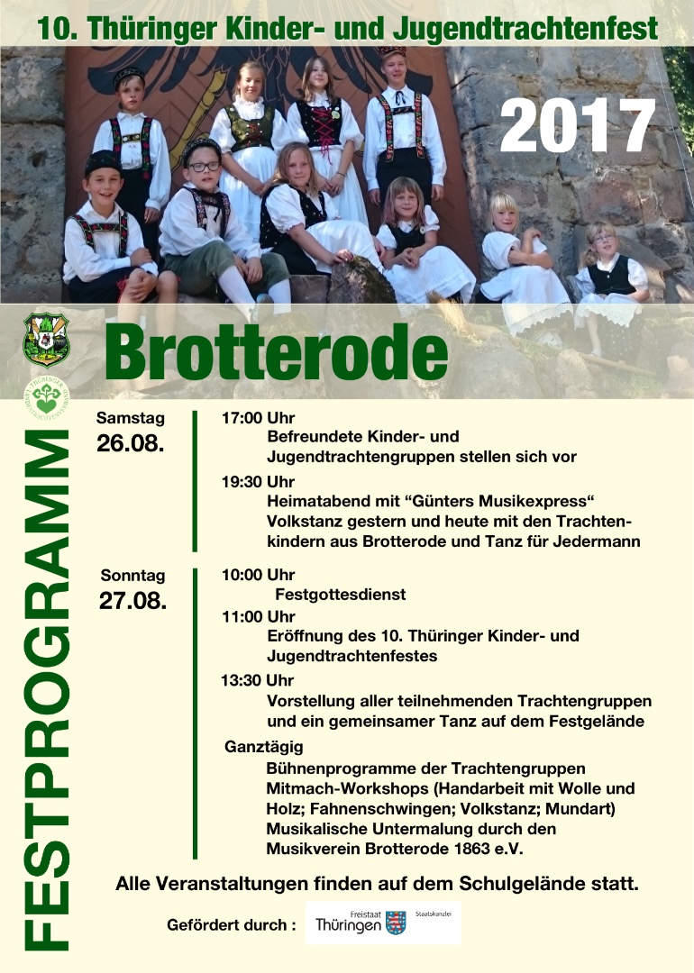 Nun treffen sich Thüringens Kinder und Jugendliche vom 26. bis 27. August 2017, um in Brotterode zwei Tage heimatliches Brauchtum zu pflegen. Kaum hat die Schule wieder angefangen stehen die Trachtenkids bereit, um in fröhlichen Tänzen, mit flotten Dialekten und kessen Weisheiten die Nachbarschaft rund um den Inselberg davon zu überzeugen, dass Zukunft auch Herkunft braucht. In der Mundart muss man einfach nicht jedes Wort verstehen, bei der Mundart ist es eben wie in der Ehe, jedes zweite Wort reicht, um gut miteinander auszukommen. Beim Tanze braucht man keinen teuren Tanzmeister zu buchen, kein Fitnessstudio zu quälen, hier reicht es sich die Hände zu reichen und mitzumachen. Wer in jungen Jahren im Tanzschritt beginnt, wird dem Partner im Alter nicht auf die Füße treten!