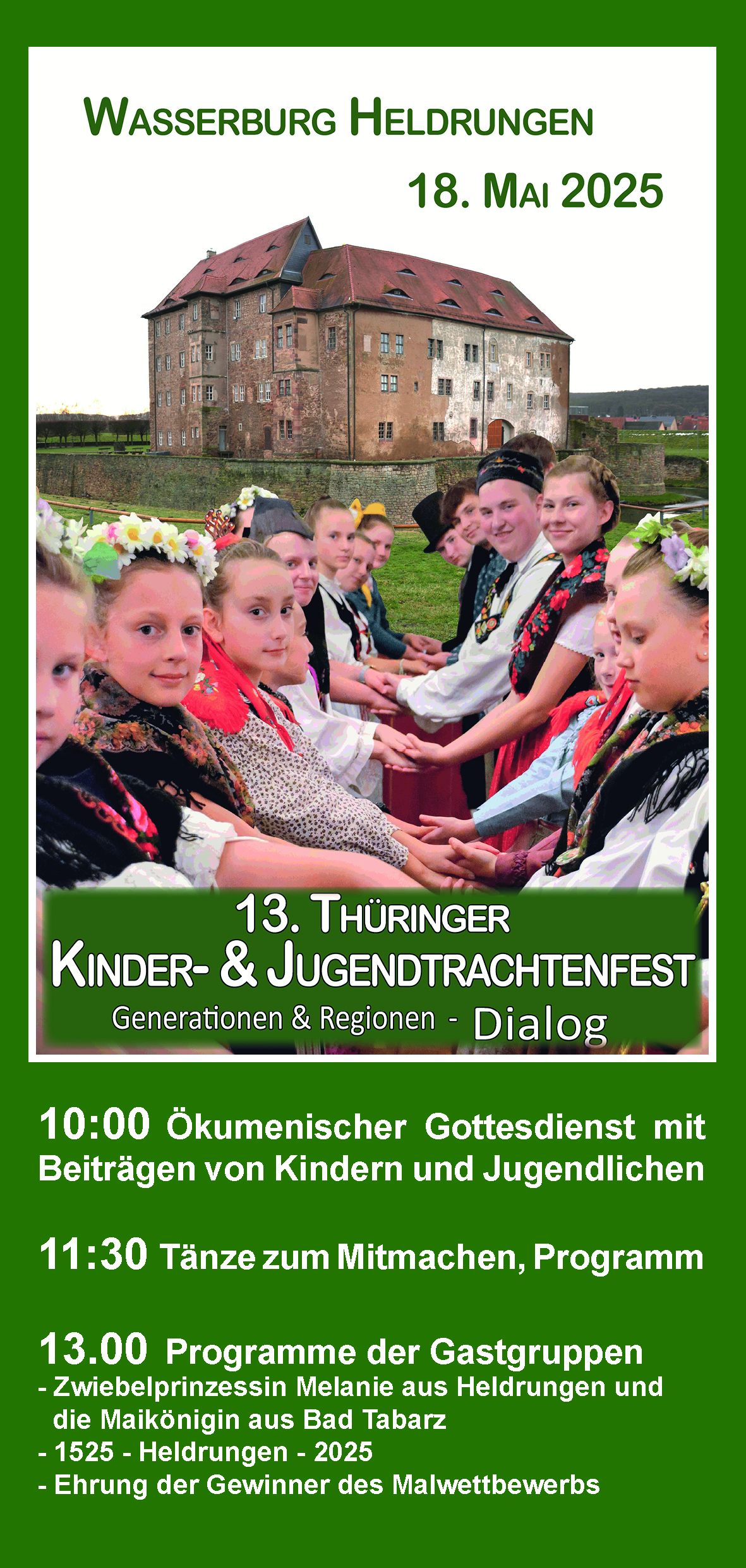 Bereits am Samstag, dem 17. Mai 2025 um 14:30 Uhr wird in Heldrungen durch die Ortschaft Heldrungen und die Thüringer Trachtenjugend an der Ecke Schloßstraße/Hauptstraße eine Linde gepflanzt und es gibt einen kurzen Programmbeitrag. Die Mühlenpfeiffer geben dazu eine musikalische Einlage. Dazu wird recht herzlich eingeladen.