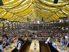Nach dem erfolgreichen Festzug wartete auf die Gruppe ein weiteres Highlight: Die Einladung ins Paulaner Festzelt, wo bei Hendl und Maß auf einen gelungenen Auftritt angestoßen wurde.