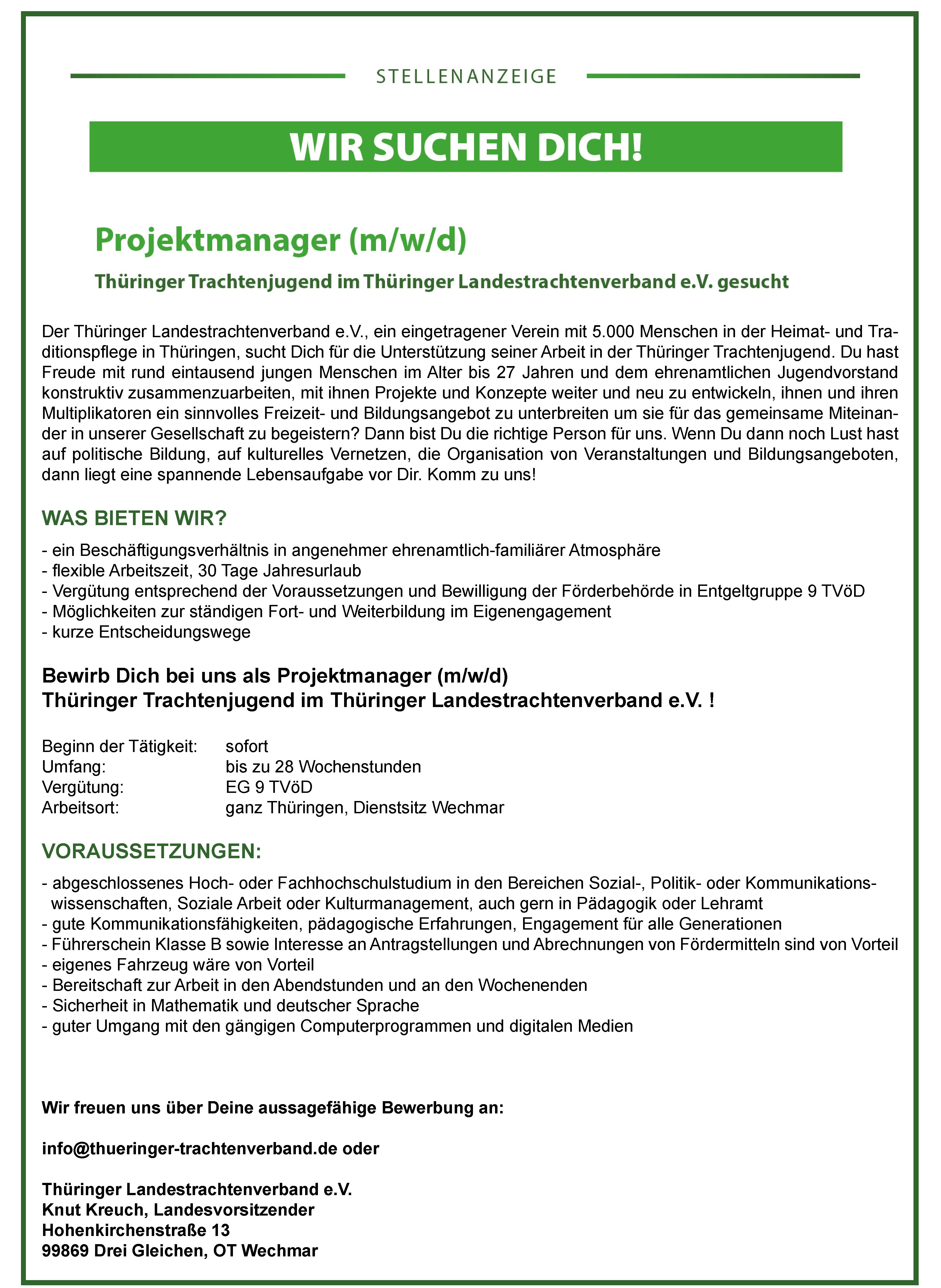 Stellenangebot: Projektmanager*in (m/w/d) für die Thüringer Trachtenjugend