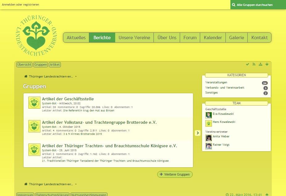 Die Arbeit jedes einzelnen Vereins ist wichtig! Jeder Artikel, jede gut besuchte Veranstaltung und jedes Bild trägt zur Heimat- und Brauchtumspflege bei. Wir würden uns über Eure Mitarbeit freuen. Neben dem Forum für alle Interessierten, geben wir auf Anfrage gerne einen exklusiven Schreibzugang für die Bereiche „Berichte“, „Kalender“ und „Galerie“, damit Ihr selbst Inhalte einstellen könnt. Damit macht ihr auch gleichzeitig Werbung für Euren Verein und für Eure Veranstaltungen. Zur Info: Es besteht auch die Möglichkeit, das mehrere aus einem Vereinen mitarbeiten können.